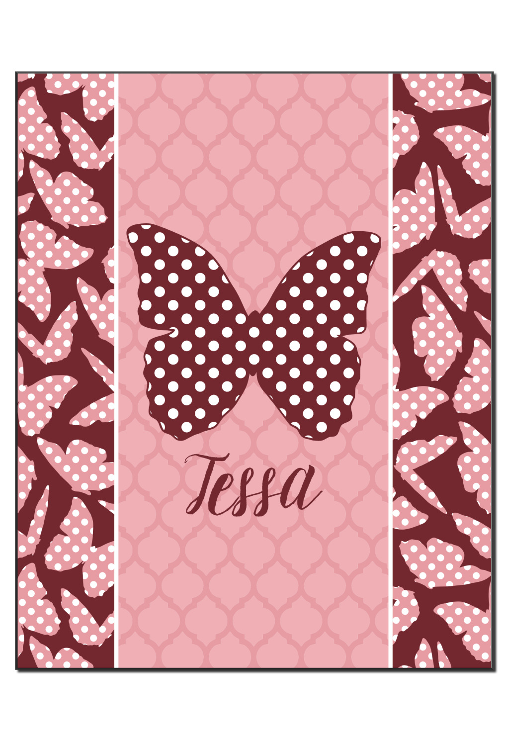 The design is split up in three parts with a polka dot butterfly pattern on either side of the middle section which has a subtle moroccan background. The foreground is personalized with a name and a fun polka dotted butterfly graphic above it. The blush and maroon compliment each other quite nicely. Easily change any of these design elements within the design center.