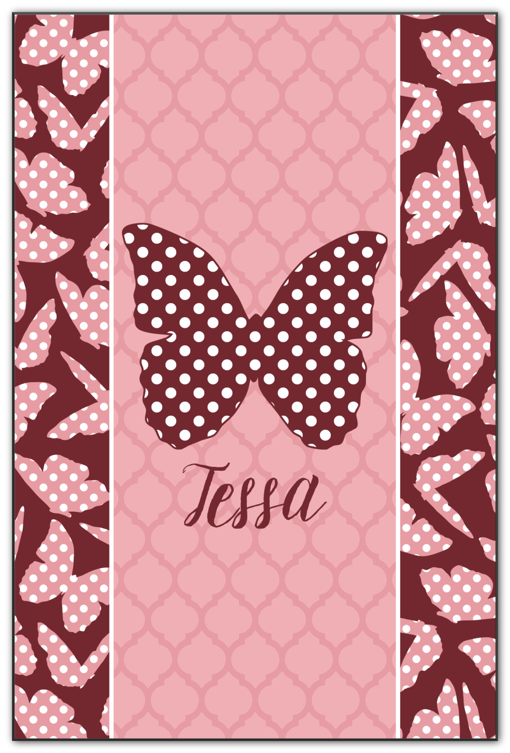 The design is split up in three parts with a polka dot butterfly pattern on either side of the middle section which has a subtle moroccan background. The foreground is personalized with a name and a fun polka dotted butterfly graphic above it. The blush and maroon compliment each other quite nicely. Easily change any of these design elements within the design center.