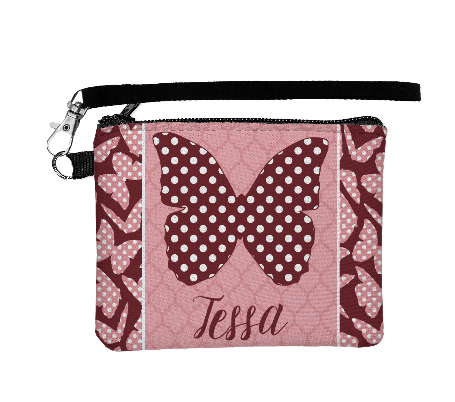 The design is split up in three parts with a polka dot butterfly pattern on either side of the middle section which has a subtle moroccan background. The foreground is personalized with a name and a fun polka dotted butterfly graphic above it. The blush and maroon compliment each other quite nicely. Easily change any of these design elements within the design center.