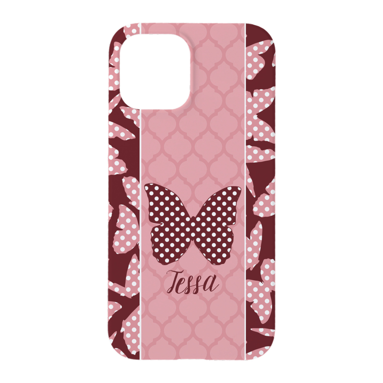 The design is split up in three parts with a polka dot butterfly pattern on either side of the middle section which has a subtle moroccan background. The foreground is personalized with a name and a fun polka dotted butterfly graphic above it. The blush and maroon compliment each other quite nicely. Easily change any of these design elements within the design center.