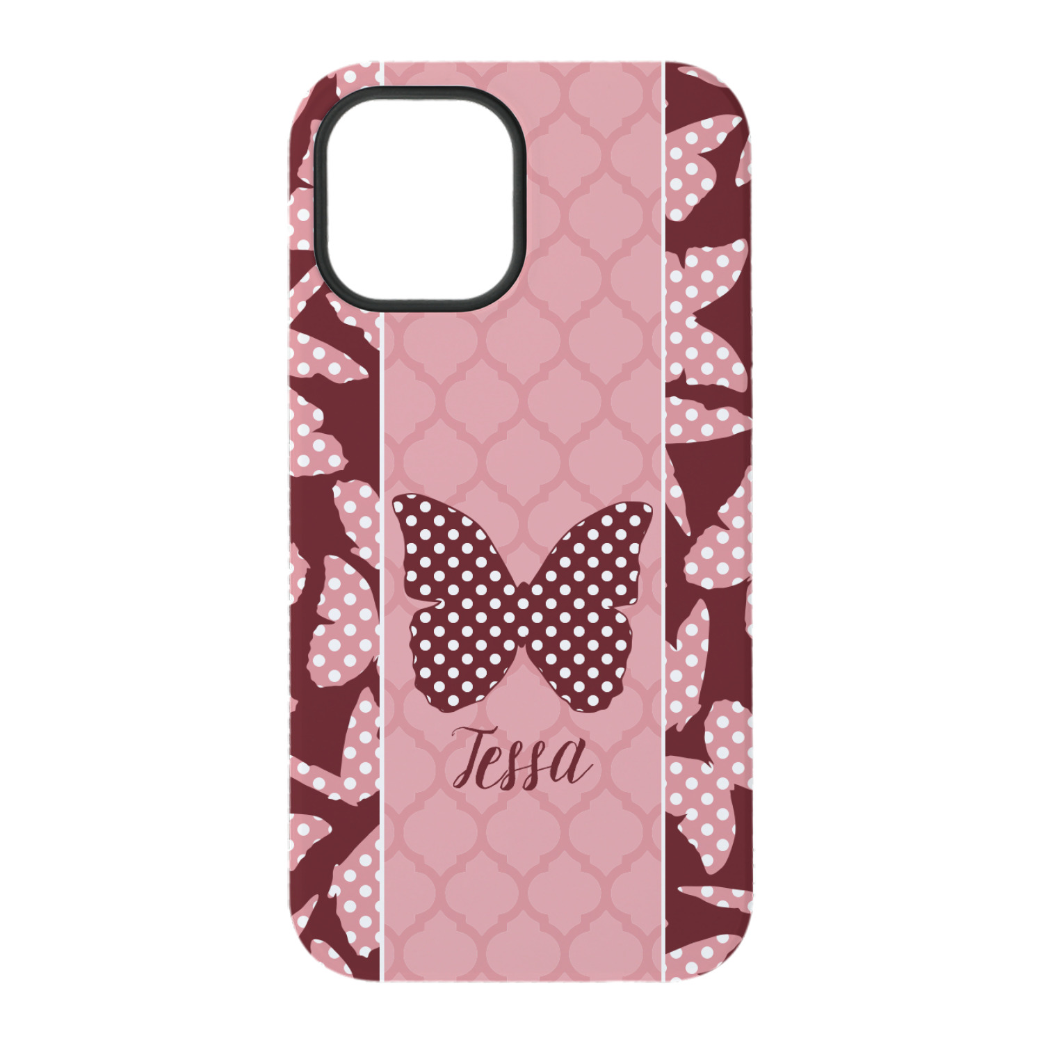 The design is split up in three parts with a polka dot butterfly pattern on either side of the middle section which has a subtle moroccan background. The foreground is personalized with a name and a fun polka dotted butterfly graphic above it. The blush and maroon compliment each other quite nicely. Easily change any of these design elements within the design center.