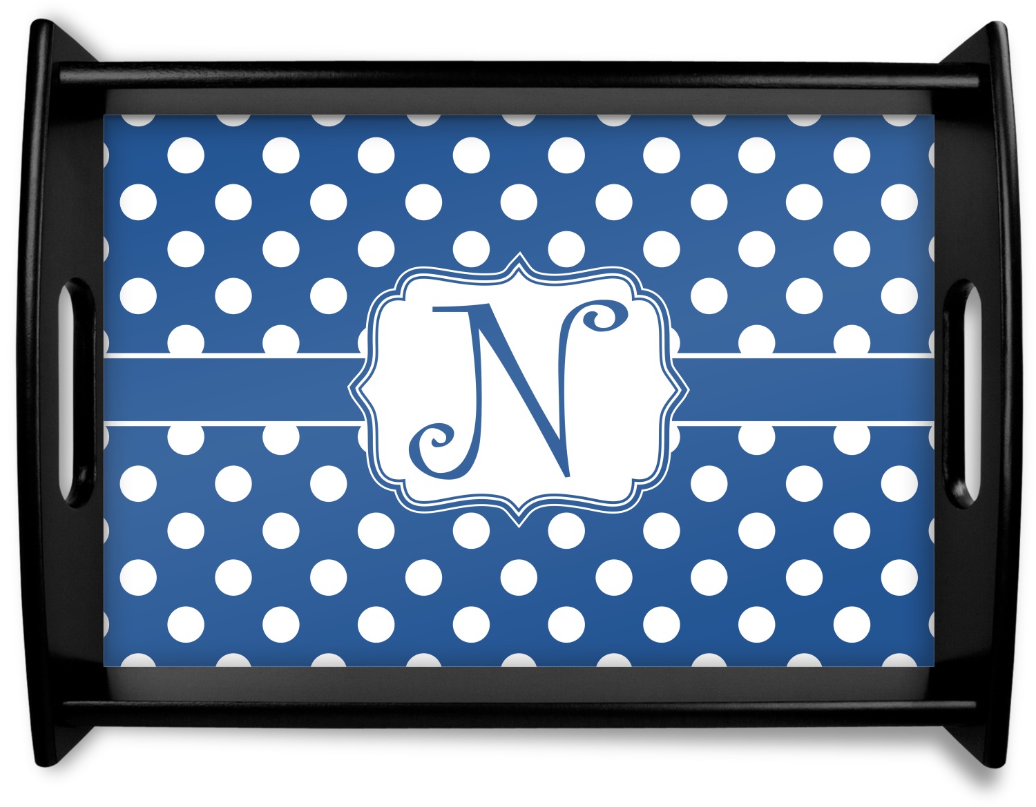 This serving tray with handles features square edges and two rounded sides, creating a very modern look. Each side is fabricated from a beautifully cut, natural wood. The bottom of the interior of the tray displays your customized design in bright, vibrant color. The tray is sold in both a black color and a natural wood look. Each variation of the wood serving tray has two sizes: Small, which is 14" x 10" x 2.25", and Large, which is 19.5" x 13.5" x 2.75".