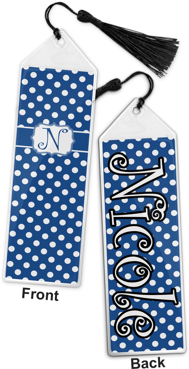 Your personalized bookmark is made of a sturdy, clear vinyl, and is approximately 7.5" x 2.25". We display your personalization on vinyl inserts that are placed on both sides. Accompanying each book marker is a black, fringe tassel that attaches to the reinforced, triangular header.