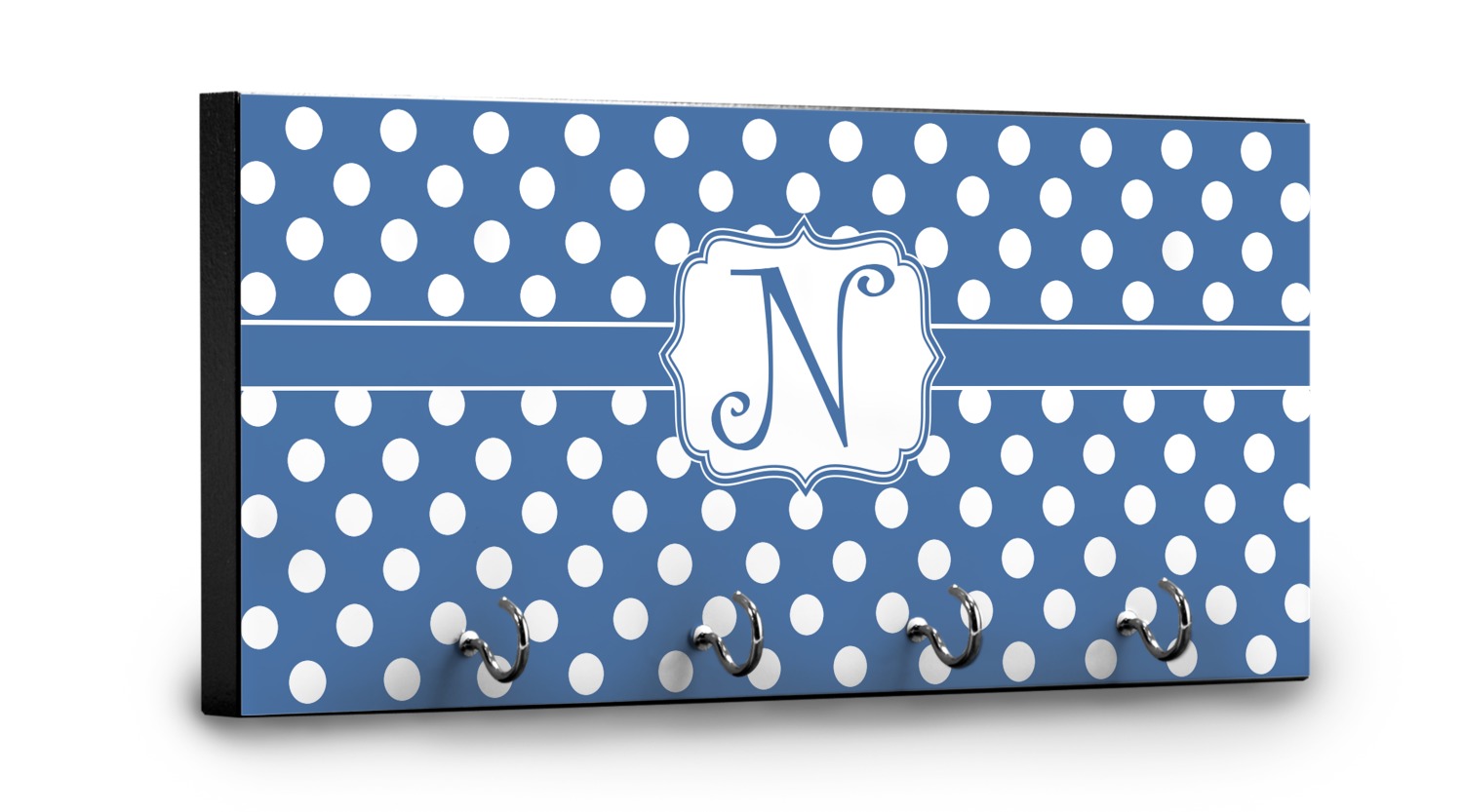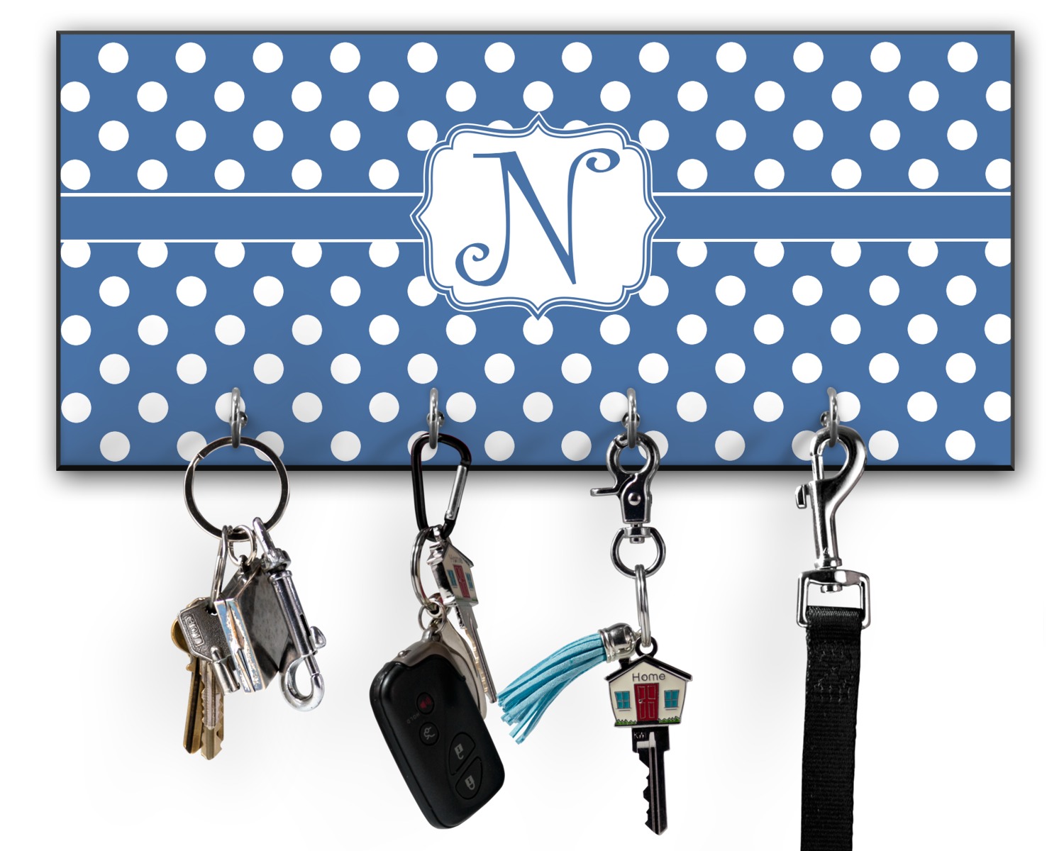 This 11" x 5" key hanger is made of sturdy wood and has four metal hooks lining the bottom. This is the perfect size for a family with several drivers. Not only can you hang keys on it though, but pet leashes and other small items. The board is black on the sides and back and is printed with the design of your choice on the front.