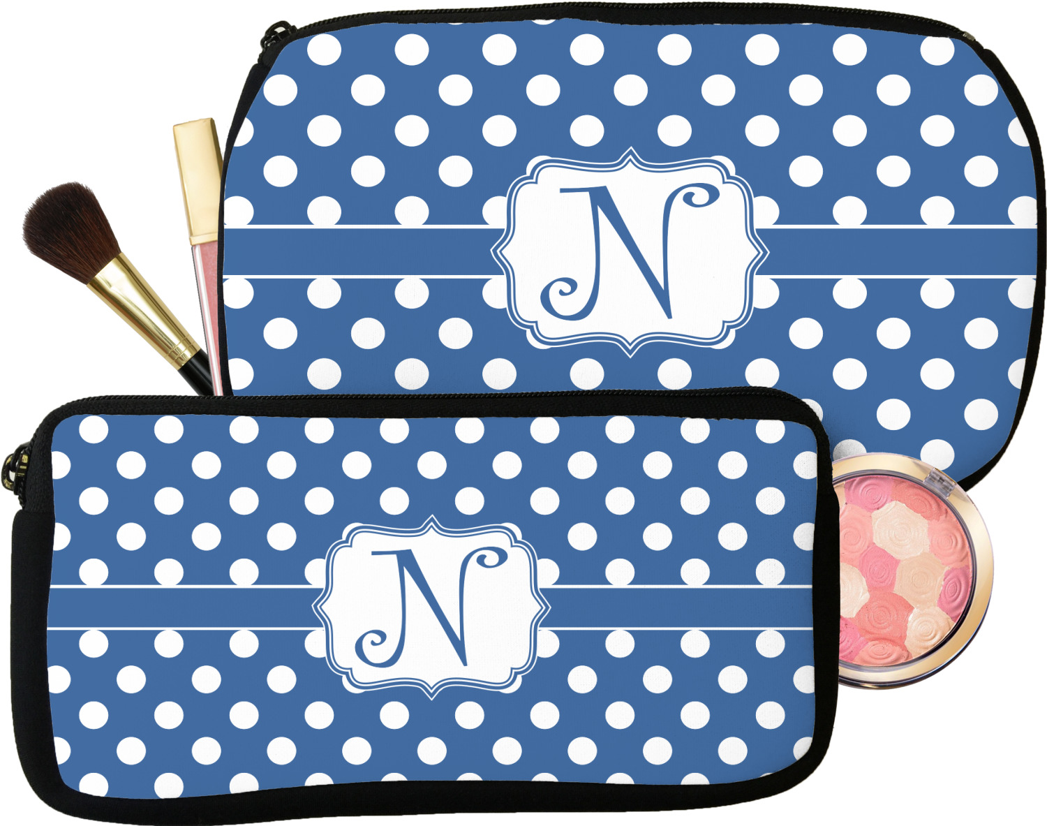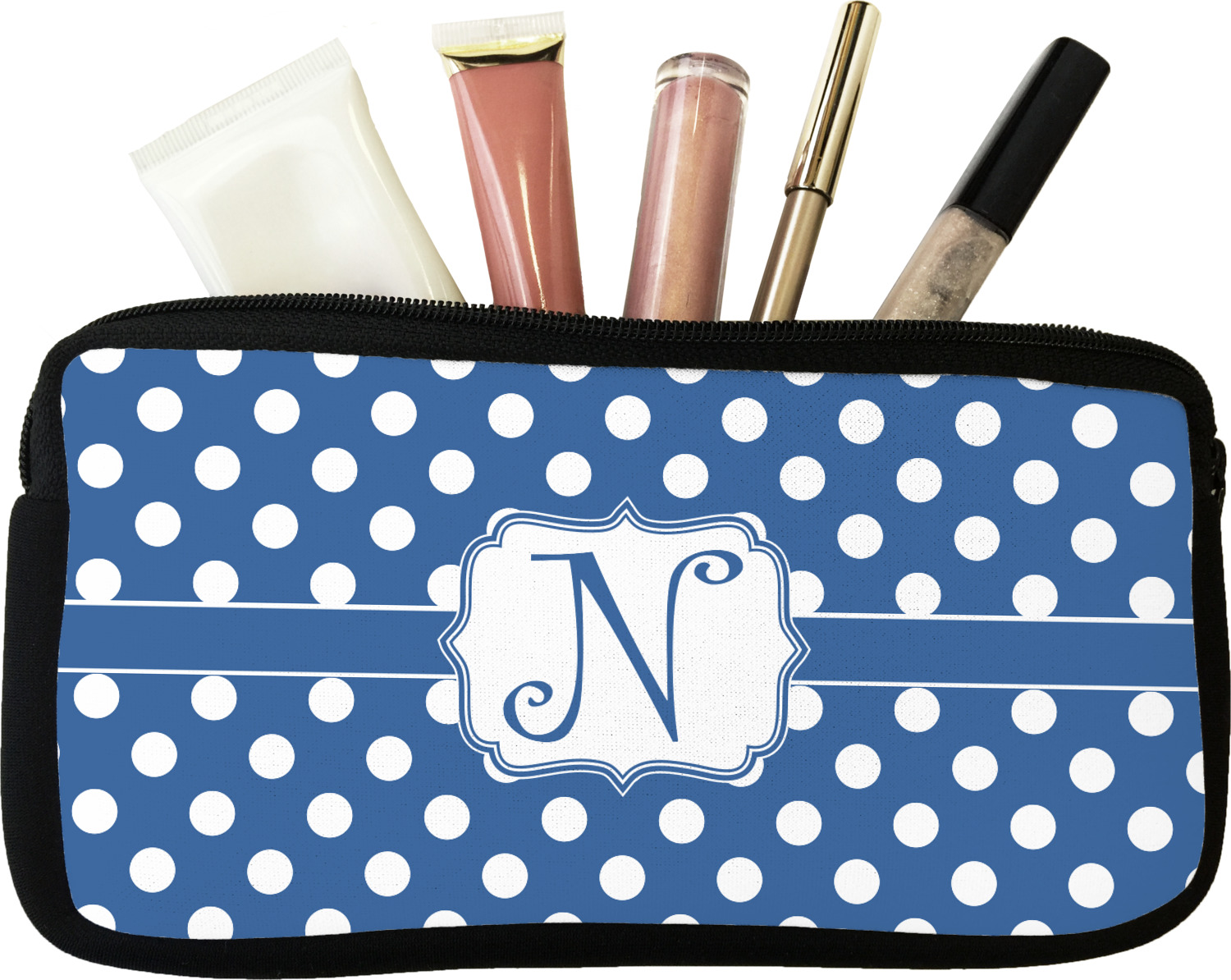 Our personalized makeup bags are available in many different designs, patterns and colors - so you are sure to find one that will love. They are made of neoprene (same material as wet-suits) and thus are water resistant, so spillages in your makeup bag will not end up all over you purse. They are customized on one side and are black on the other side and the zipper is black as well.