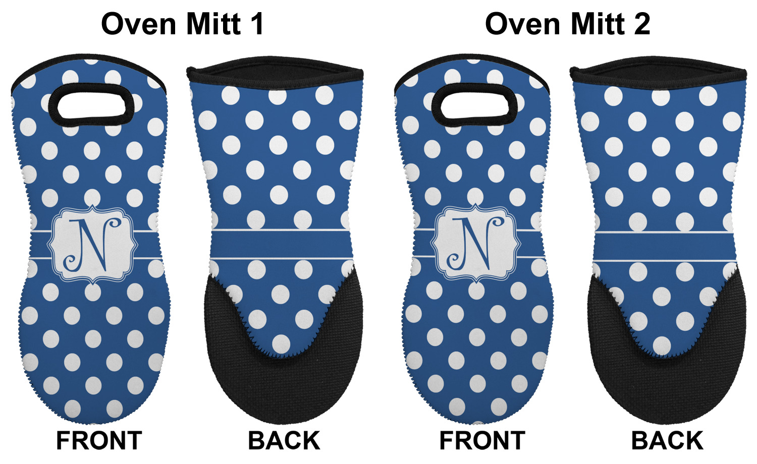 These heat resistant gloves are made entirely of a durable neoprene; the front features a softer texture, while the palm's side has a textured surface, meant to handle heat up to 500 degrees Fahrenheit. Thick, heavy duty stitching connects the two sides. A small, oval cutout appears on the front, and can be used to hang and store the mitt. Your personalization appears on the front, and the upper part of the back of the mitt. The style of these oven mitts are suitable for both the right and left hand, depending on your needs. If you need one for each hand, be sure to order two!