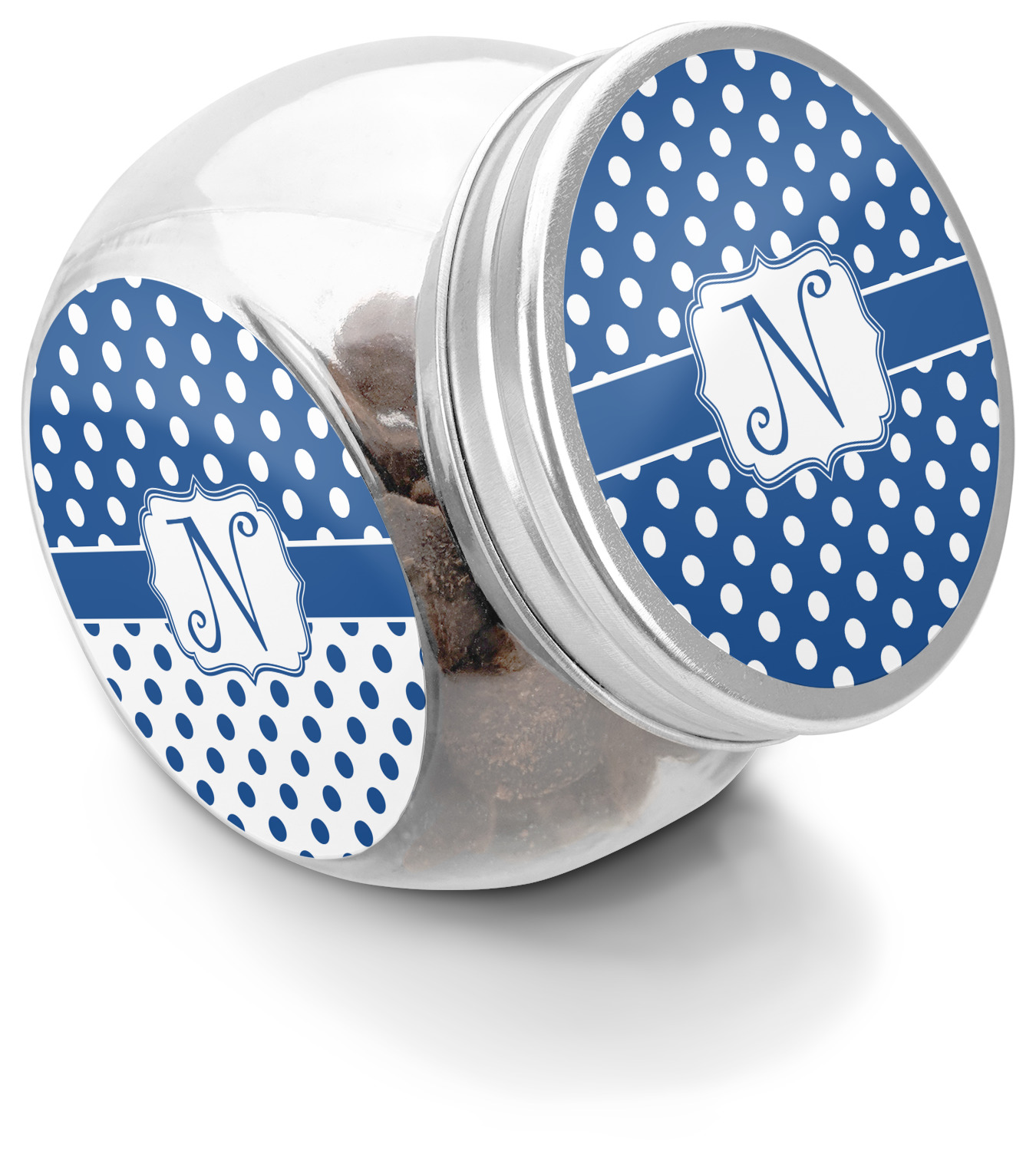 This treat jar is an excellent way to store treats for your favorite canine or feline. Moreover, their delicate, classy appearance makes them a tasteful addition to your countertop's décor. Crafted from clear glass, its unique construction and silver metal, screw-on lid allows for quick and easy access. Three, permanent, vinyl stickers are applied to both sides of the jar and lid, presenting your personalized design. The base of this glass, dog treat jar is 3.4" x 4.75", and the jar stands at 5" tall. Though on the smaller side, this jar is best suited for smaller treats or training treats.