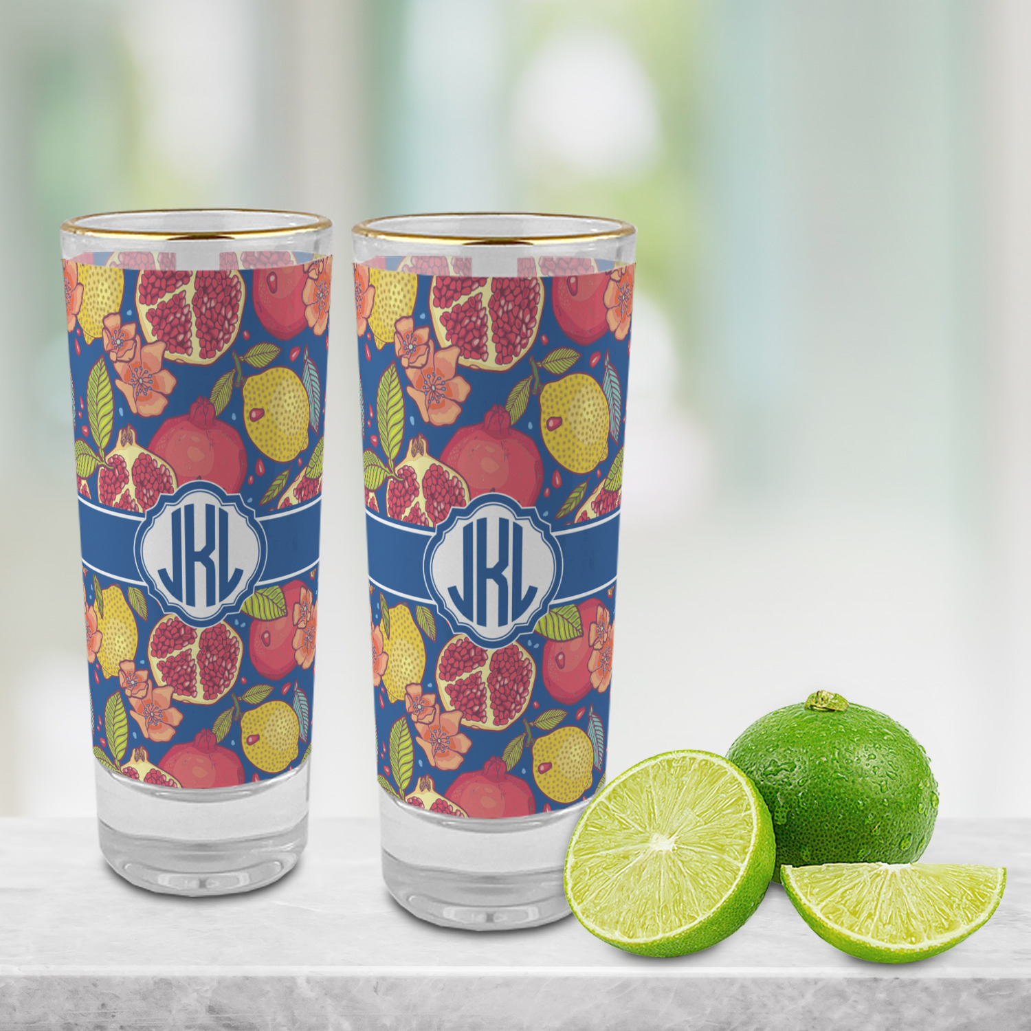 These glass shooter glasses are printed in full color with the design of your choice. These are a tall shooter 2 oz size and stand 4" tall. The print is a full wrap design to boldly display your personalization.