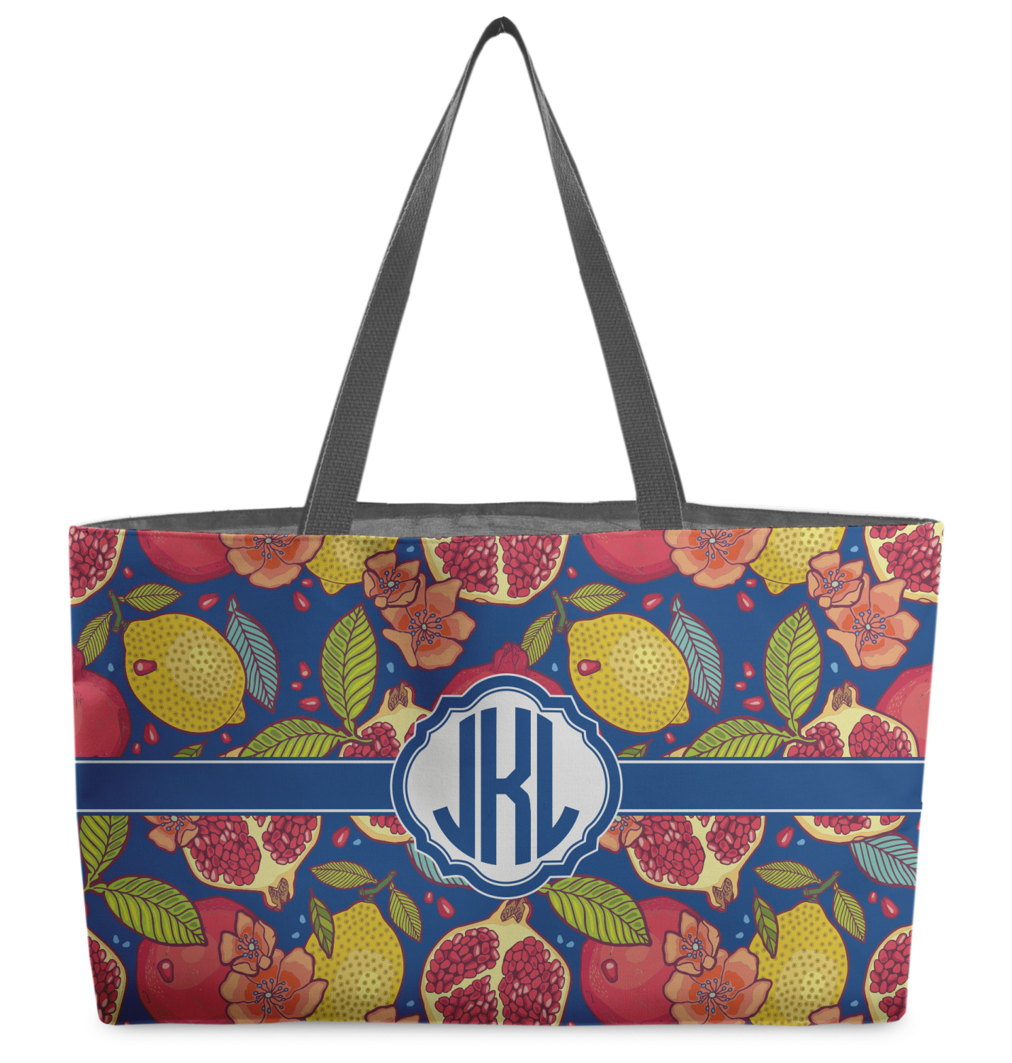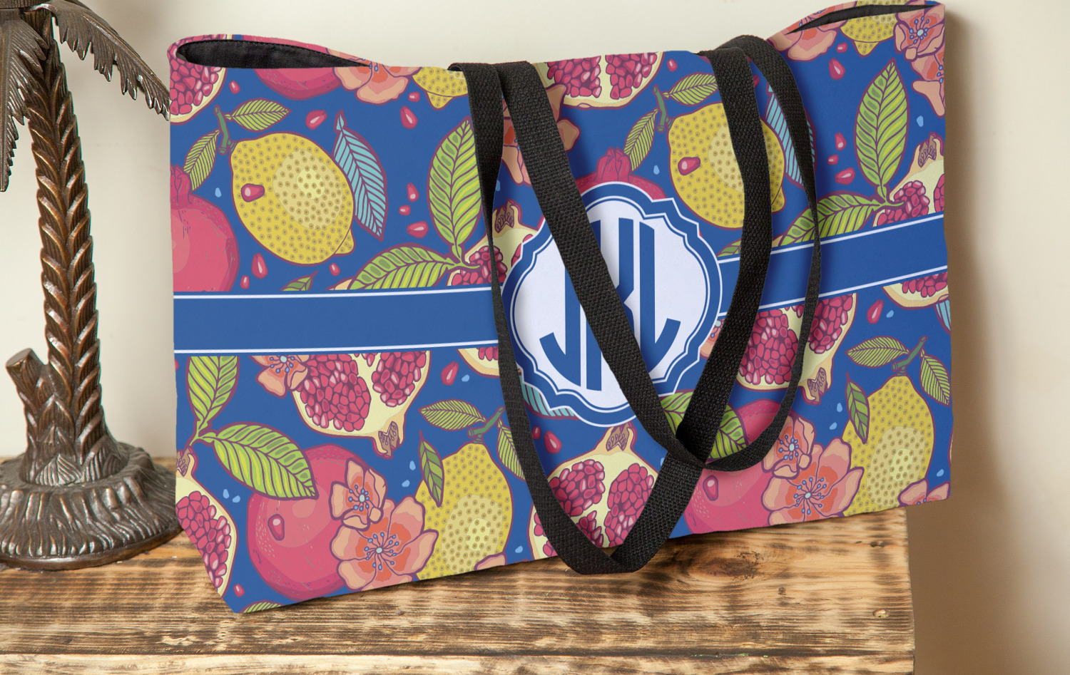 These beach totes are handmade here in the USA. Fabric is printed with your design. The tote is then sewn from the fabric pieces, lining and handles added.