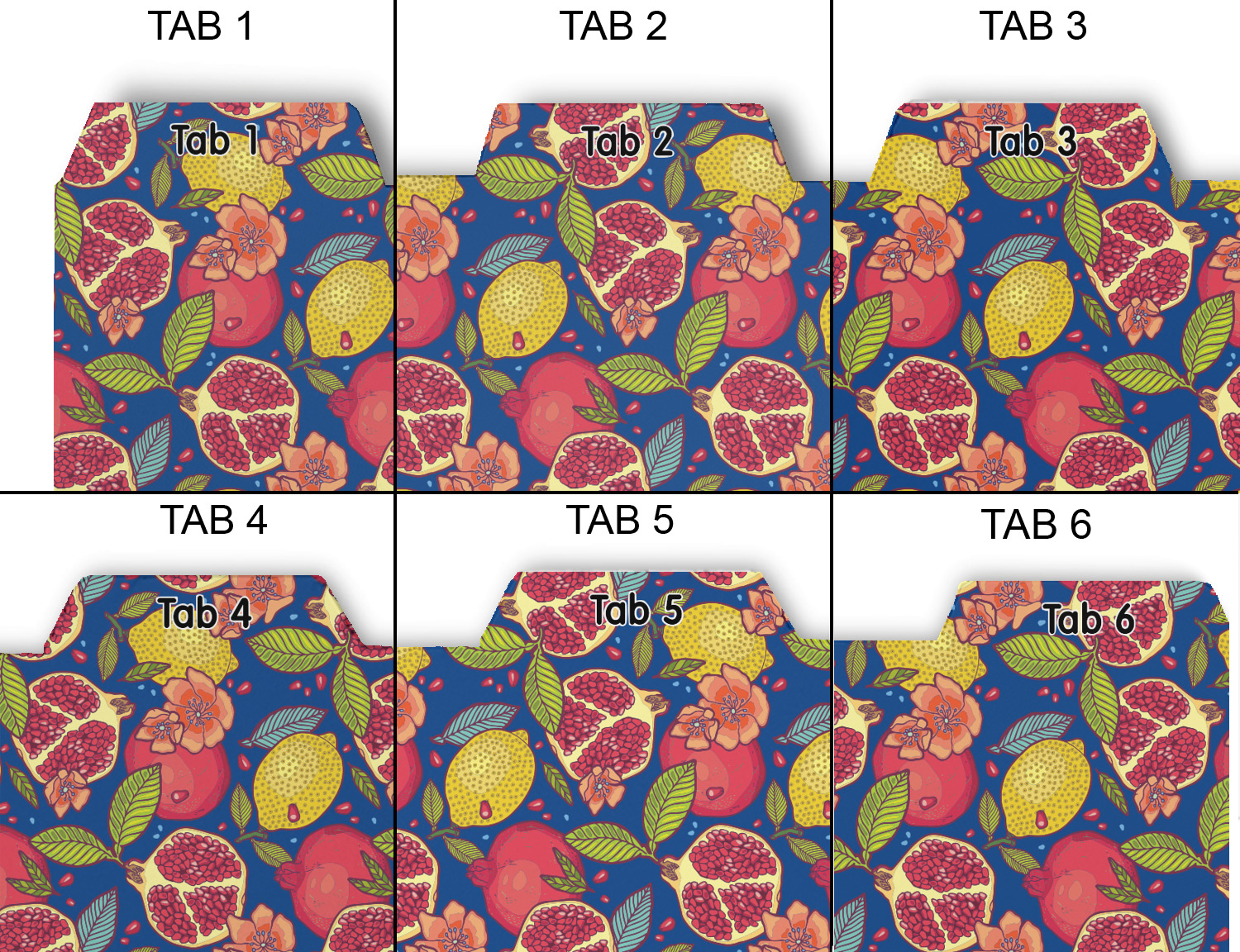 Whether you use binders at school or at work, we have designs to suit all of them. Available in 5 or 6 tab sets, you are sure to find a set to suit your needs. The back of each one is white and can be used to take notes, write vital information on, etc.
