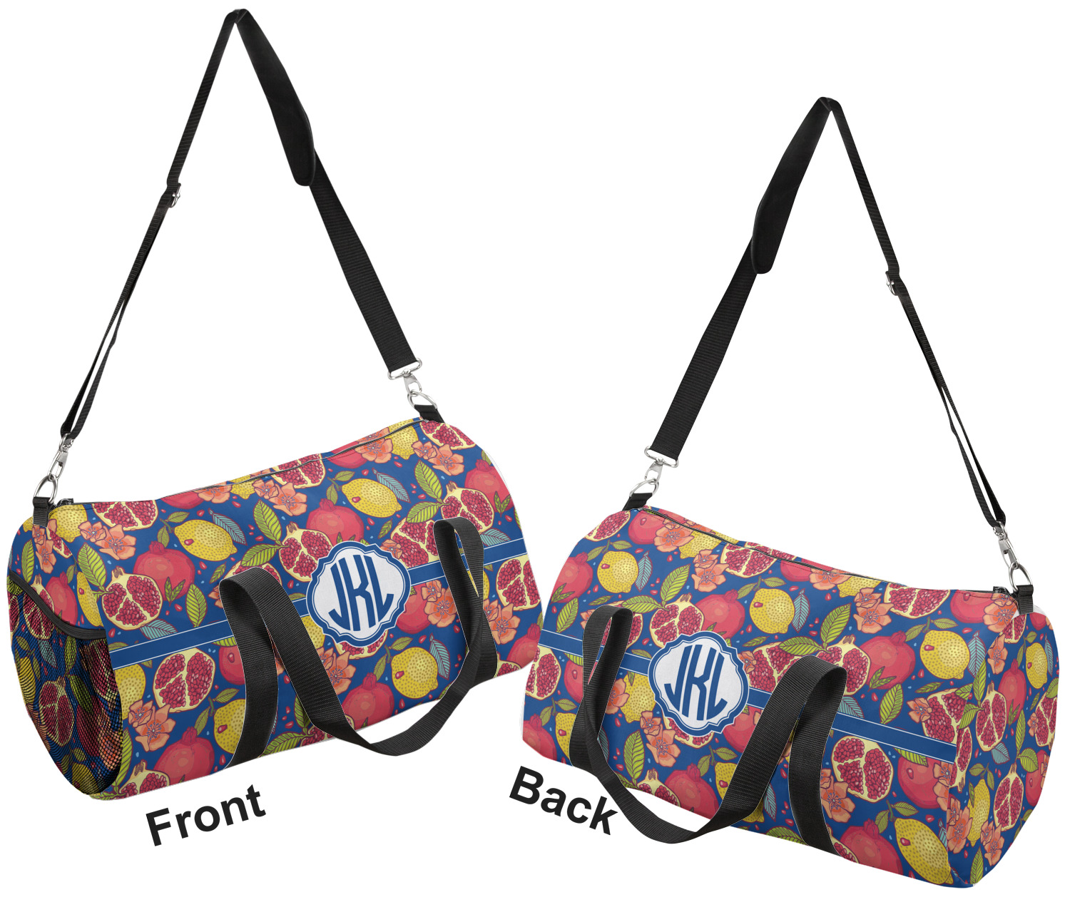 This duffle is a sturdy bag made of a canvas material. It comes in two sizes: Small (19"W x 9.5"H x 9.5"D) and Large (23"W x 12"H x 12"D). The bag is a cylindrical shape with a black adjustable strap and two handles. On one side is an elastic pouch to put a waterbottle or other small item. Your product will be sublimated with your design and is able to be designed on the front, back, and sides. Be sure to remember that the straps may cut into parts of your design if you upload your own artwork.