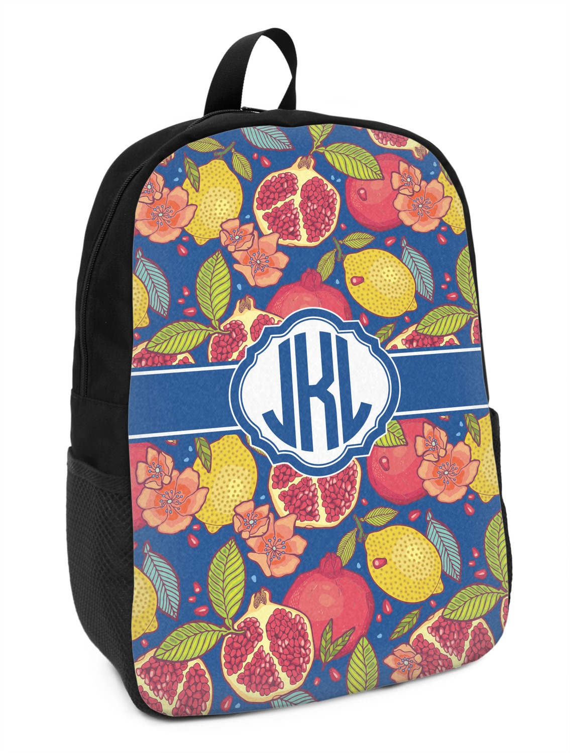 These small backpacks are made of a durable black canvas material with your personalization right on the front. The two shoulder straps are padded and easily adjustable. The bag itself measures at about 11" W x 15" H x 5" D. It's the perfect size for elementary aged kids or adults who want a smaller backpack. On the top of the bag you will find a handle to hang or carry your backpack by as well as a large zipper closure to keep all of your belongings safe inside. On each side of your backpack is a mesh pocket for a small item or water bottle. Inside your backpack you will find a spacious area with a small zipper pocket and a padded laptop slot that will fit up to a 13" laptop (13" being very snug). This is the perfect bag for any student that needs a couple books and their laptop with them at all times. It also works great as a carry on for traveling!