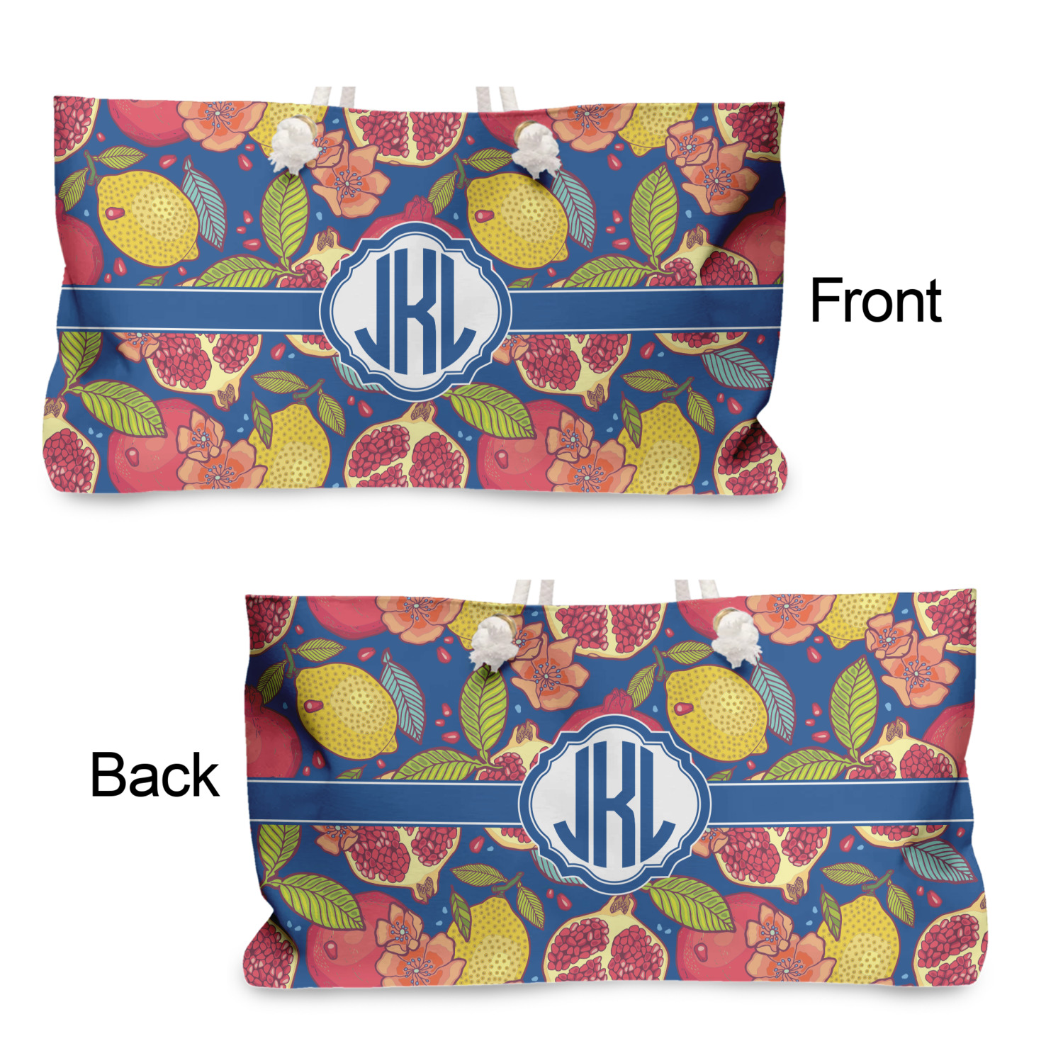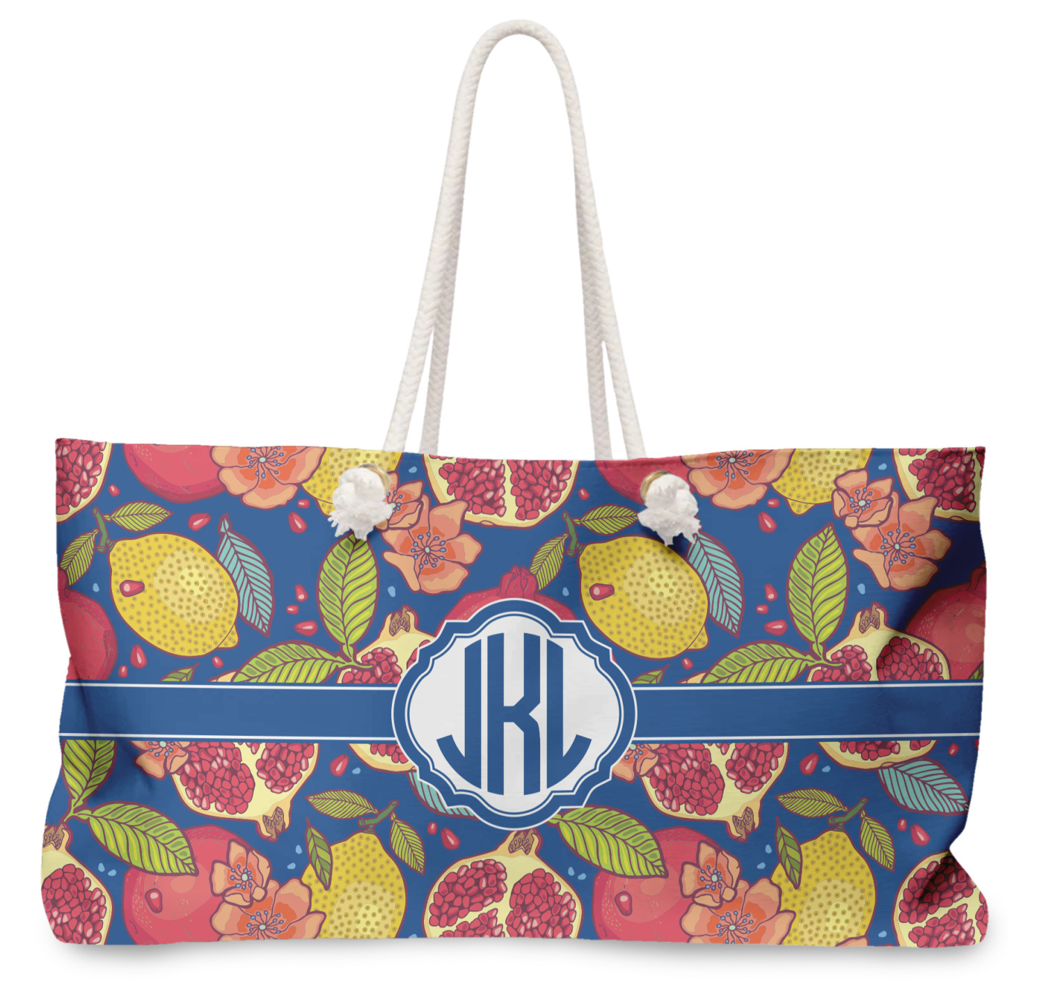 These large totes are handmade i.e. printed, cut and sewn right here in the USA. The canvas like material is printed using dye sublimation; the fabric is then cut and sewn along with a beautiful cream colored lining (to match the rope handles). The brass grommets are then added and the cream colored rope if fed through the grommets and knotted.