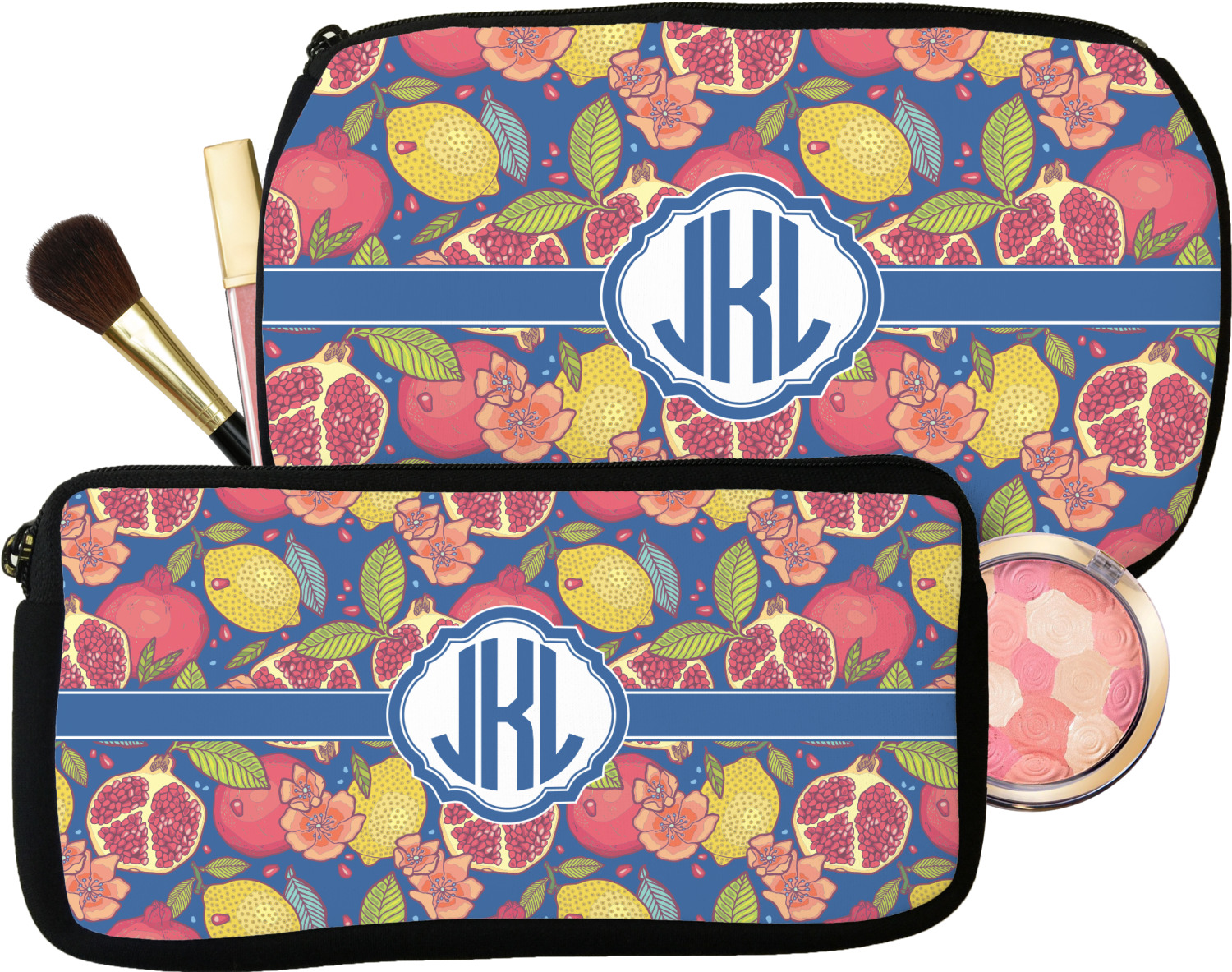 Our personalized makeup bags are available in many different designs, patterns and colors - so you are sure to find one that will love. They are made of neoprene (same material as wet-suits) and thus are water resistant, so spillages in your makeup bag will not end up all over you purse. They are customized on one side and are black on the other side and the zipper is black as well.