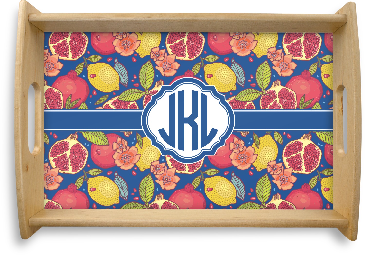 This serving tray with handles features square edges and two rounded sides, creating a very modern look. Each side is fabricated from a beautifully cut, natural wood. The bottom of the interior of the tray displays your customized design in bright, vibrant color. The tray is sold in both a black color and a natural wood look. Each variation of the wood serving tray has two sizes: Small, which is 14" x 10" x 2.25", and Large, which is 19.5" x 13.5" x 2.75".