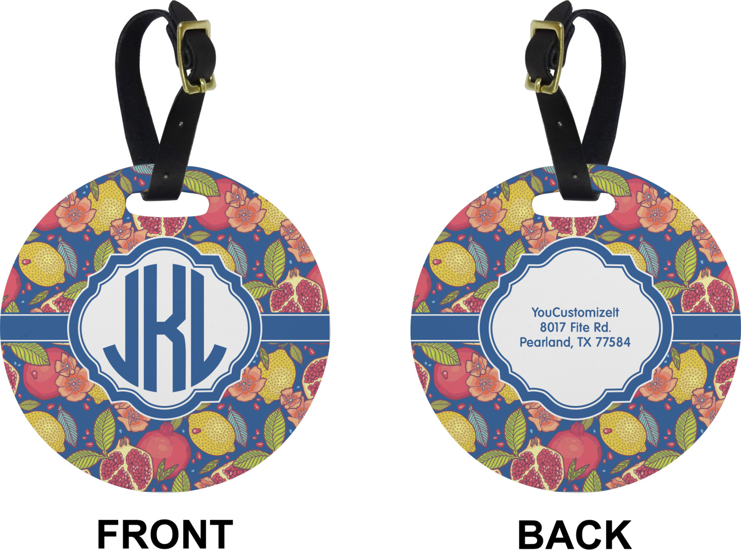 These personalized bag tags are sold in a variety of shapes, so that you may find the product that meets your vision exactly. We sell a round luggage tag, which measures at approximately 4" x 4". Our square luggage tag is about 3.5" x 3.5", while our rectangular version is 2.75" x 4 ".