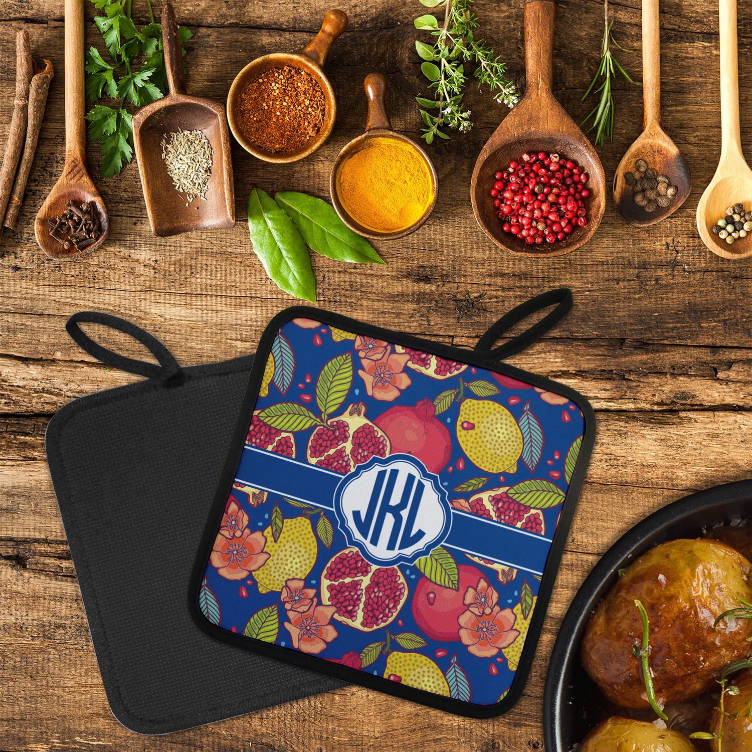 Our personalized pot holders feature a neoprene front that displays your personalization in vibrant colors. The backing of the hot pot holder is rubberized; the textured backing allows you to have a great grip when using this custom pot holder. The two materials are joined with a sleek, black trim, and the holder also includes an attached loop for hanging and storage. The pot holder is approximately 8.75 inches by 8.75 inches and 0.25 inches tall, while the fabric loop is 2.5 inches long. You can purchase a kitchen pot holder by itself or as a set of 2. We also offer a set including one pot holder and one oven mitt.
