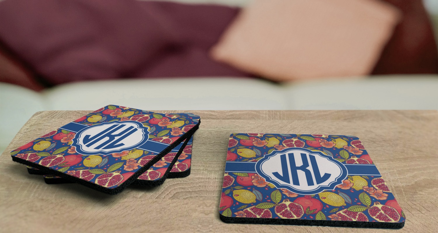 These drink coasters have a smooth, polyester top and a textured, rubber backing on its bottom. The non-slip rubber backing underneath works to keep any spills at bay. At 4 by 4 by 0.25 inches thick, these custom coasters are a suitable size for most drinkware. Your personalization is displayed atop the face of the cup coaster. We sell these rubber coasters in two different shapes: square and round. You can buy each shape as singulars or as a set of 4.