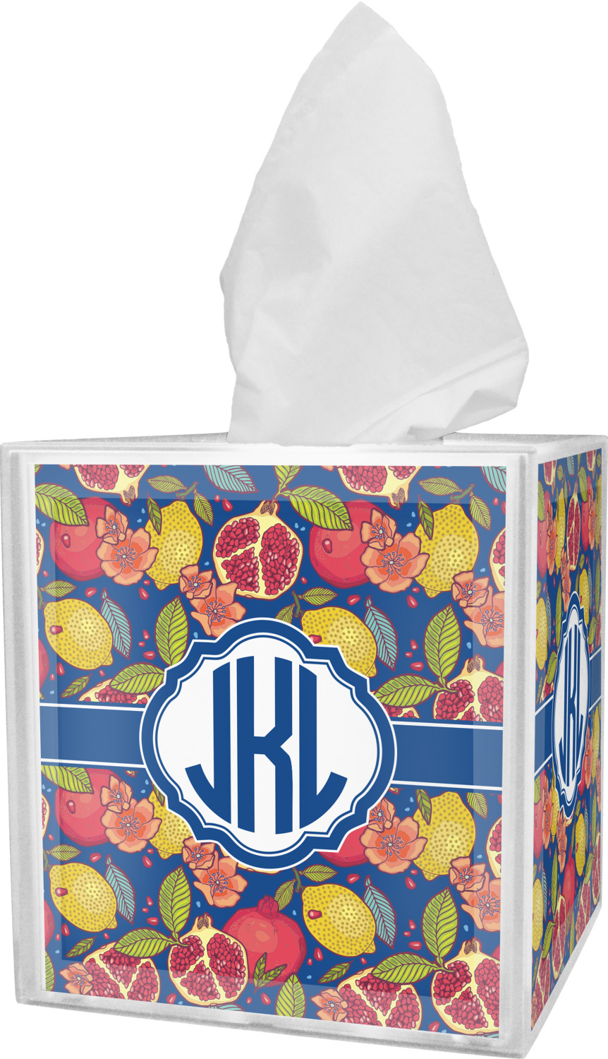 These tissue holders are built from durable acrylic and display your unique personalization on fine-quality vinyl inserts placed within the four sides and top. The box features two pieces, allowing you to easily switch out tissue boxes. On the sides, youll find ridges that ensure the top and base fit securely in place. The bottom of these tissue box holders has four, rubber, non-slip pads to prevent the box from scuffing any surface you decide to display it on. Each box can fit a standard 5 by 5-inch box of tissues.