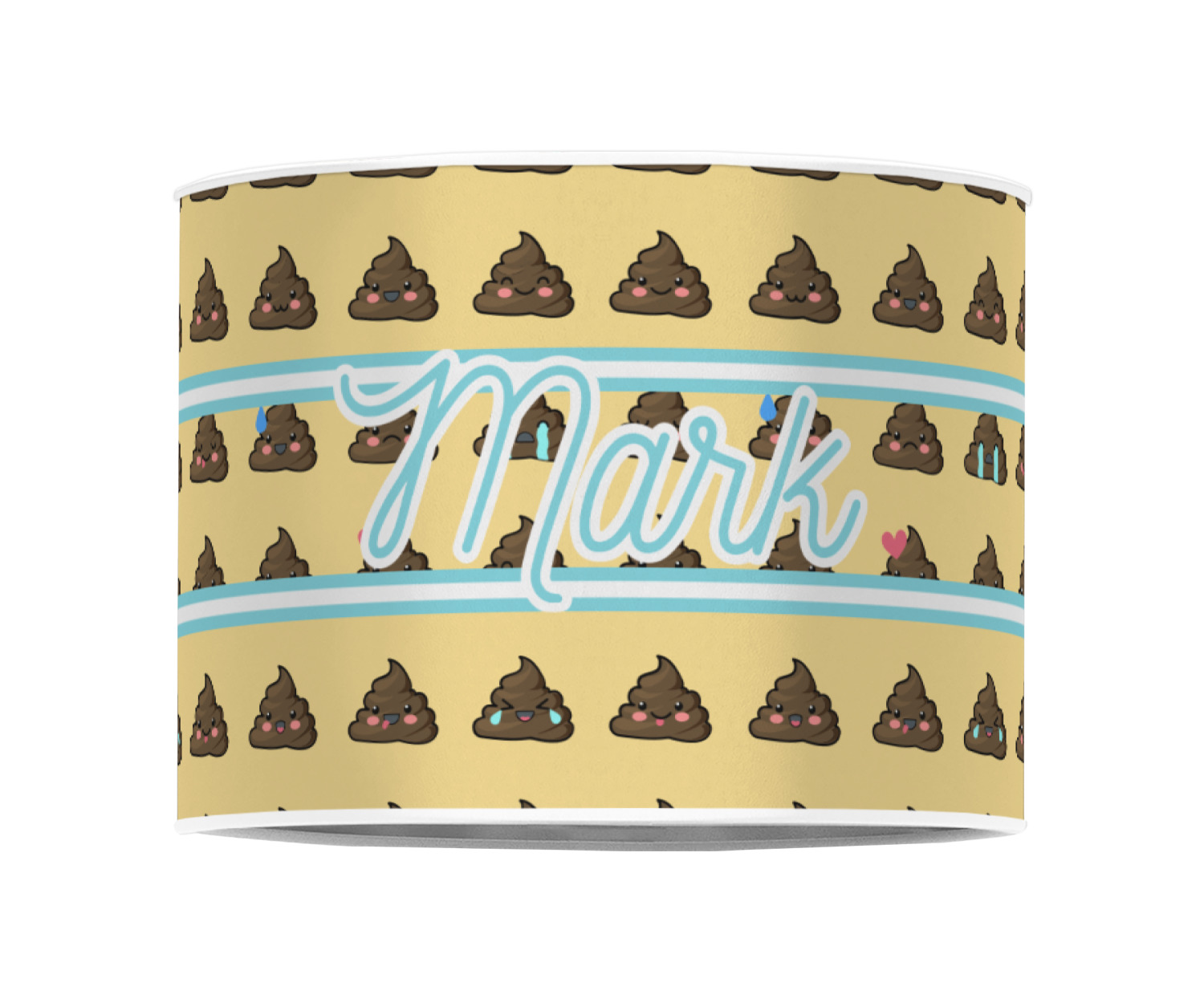The design is a fun bright yellow with brown poop emojis all over. Each emoji is making a different face! Two light teal / turquoise ribbons are use to frame your personalization in the middle of the design. The coordinating design has a fun speckled yellow background with a large poop emoji right in the middle, saying "Oh, Poo!" underneath.
