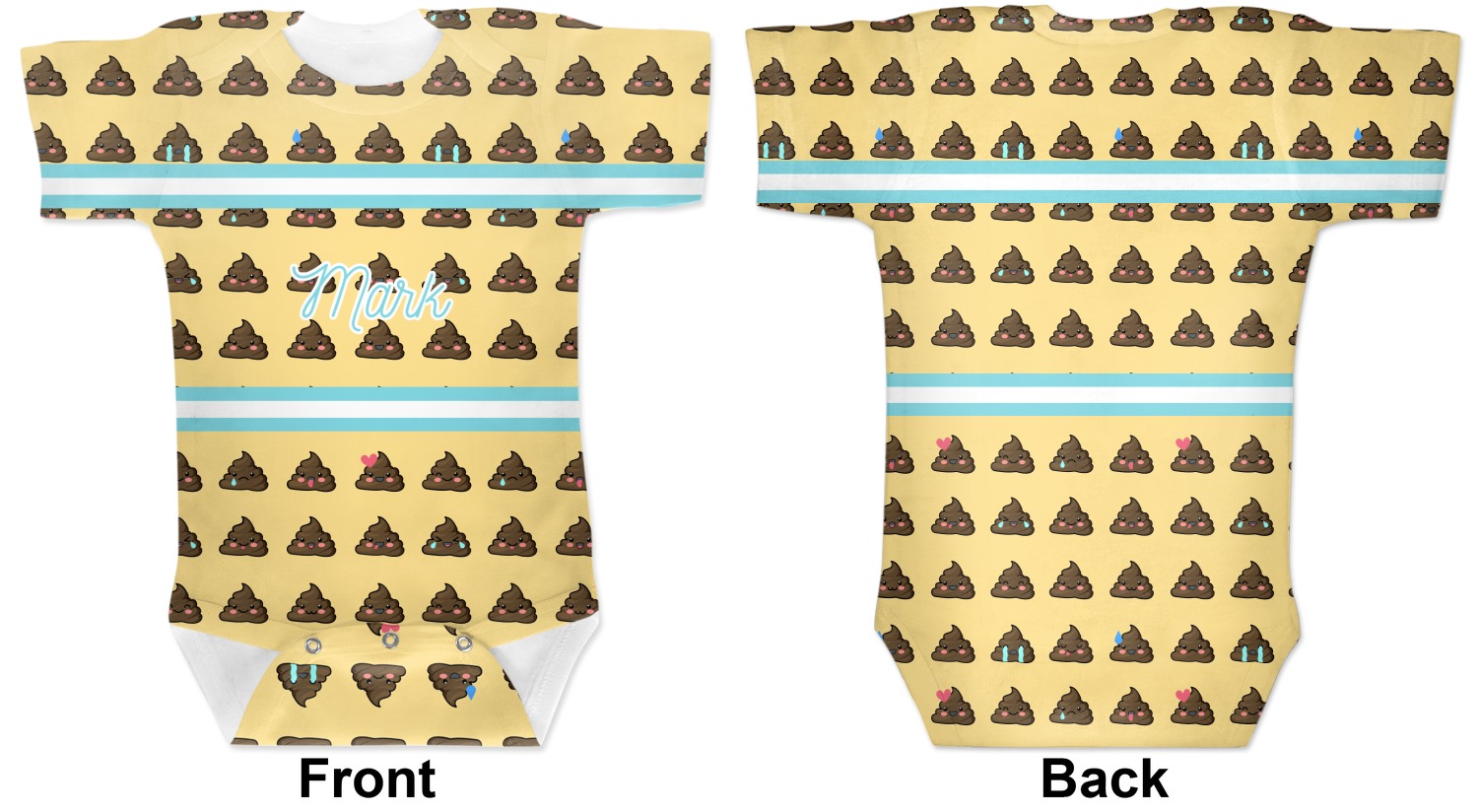The design is a fun bright yellow with brown poop emojis all over. Each emoji is making a different face! Two light teal / turquoise ribbons are use to frame your personalization in the middle of the design. The coordinating design has a fun speckled yellow background with a large poop emoji right in the middle, saying "Oh, Poo!" underneath.