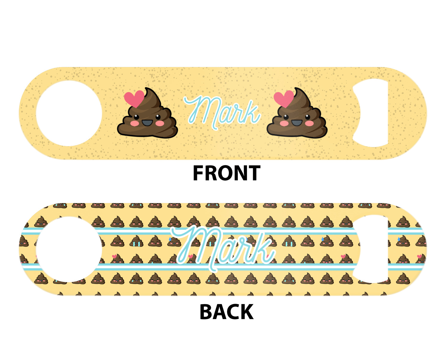 The design is a fun bright yellow with brown poop emojis all over. Each emoji is making a different face! Two light teal / turquoise ribbons are use to frame your personalization in the middle of the design. The coordinating design has a fun speckled yellow background with a large poop emoji right in the middle, saying "Oh, Poo!" underneath.
