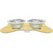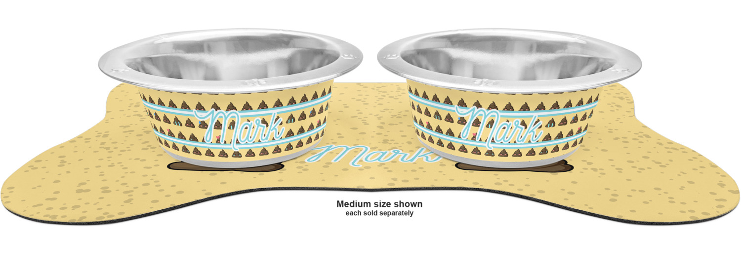 The top of this mat displays your custom design, as it is printed on polyester. To prevent slippage, the underside of the mat is made of rubber. We offer a small dog food mat, suitable for smaller dogs and a large dog food mat for bigger breeds. The small dog food mat is approximately 19 by 13 inches, while the large dog feeding mat measures at approximately 26.75 by 18 inches. Both personalized mats are ideally sized to fit two dog bowls.