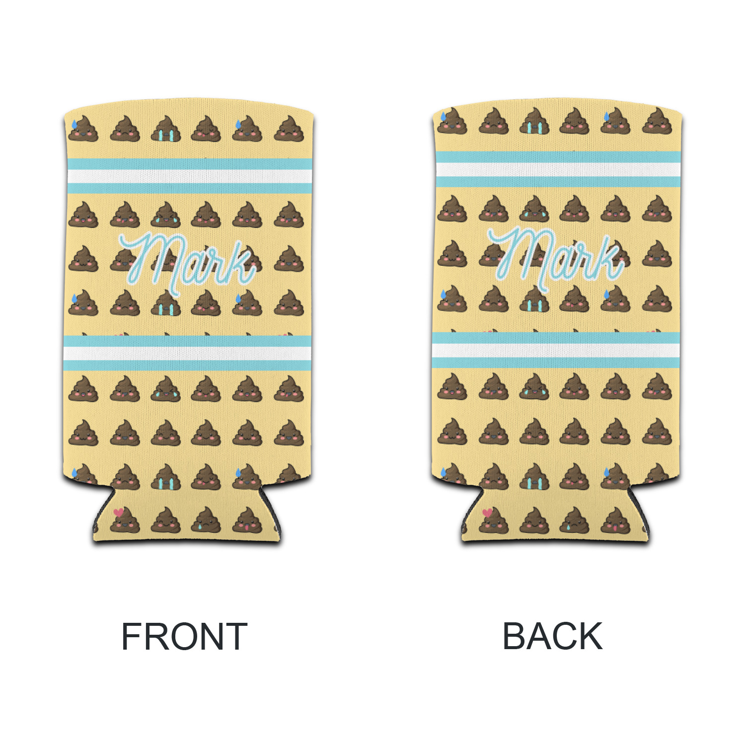 The design is a fun bright yellow with brown poop emojis all over. Each emoji is making a different face! Two light teal / turquoise ribbons are use to frame your personalization in the middle of the design. The coordinating design has a fun speckled yellow background with a large poop emoji right in the middle, saying "Oh, Poo!" underneath.