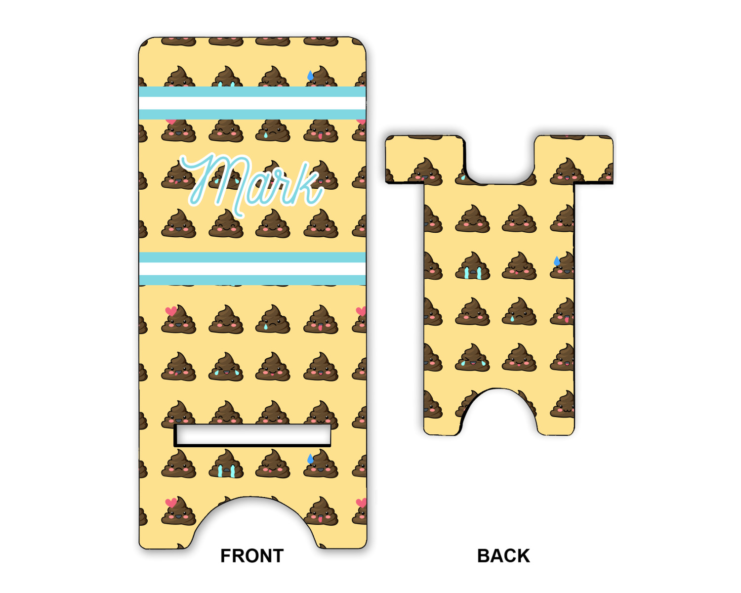The design is a fun bright yellow with brown poop emojis all over. Each emoji is making a different face! Two light teal / turquoise ribbons are use to frame your personalization in the middle of the design. The coordinating design has a fun speckled yellow background with a large poop emoji right in the middle, saying "Oh, Poo!" underneath.
