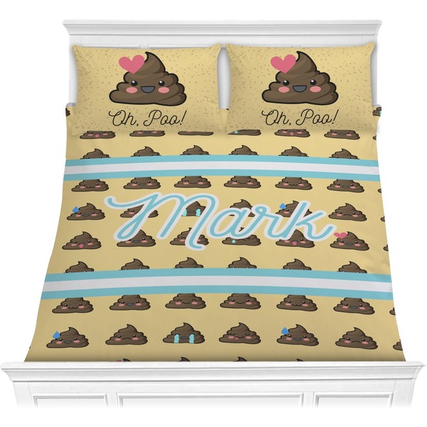 The design is a fun bright yellow with brown poop emojis all over. Each emoji is making a different face! Two light teal / turquoise ribbons are use to frame your personalization in the middle of the design. The coordinating design has a fun speckled yellow background with a large poop emoji right in the middle, saying "Oh, Poo!" underneath.