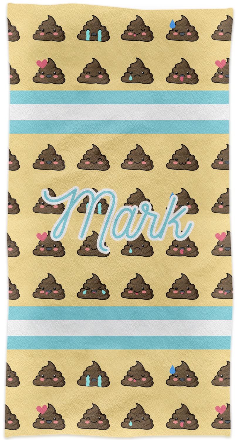 The design is a fun bright yellow with brown poop emojis all over. Each emoji is making a different face! Two light teal / turquoise ribbons are use to frame your personalization in the middle of the design. The coordinating design has a fun speckled yellow background with a large poop emoji right in the middle, saying "Oh, Poo!" underneath.
