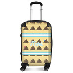 The design is a fun bright yellow with brown poop emojis all over. Each emoji is making a different face! Two light teal / turquoise ribbons are use to frame your personalization in the middle of the design. The coordinating design has a fun speckled yellow background with a large poop emoji right in the middle, saying "Oh, Poo!" underneath.