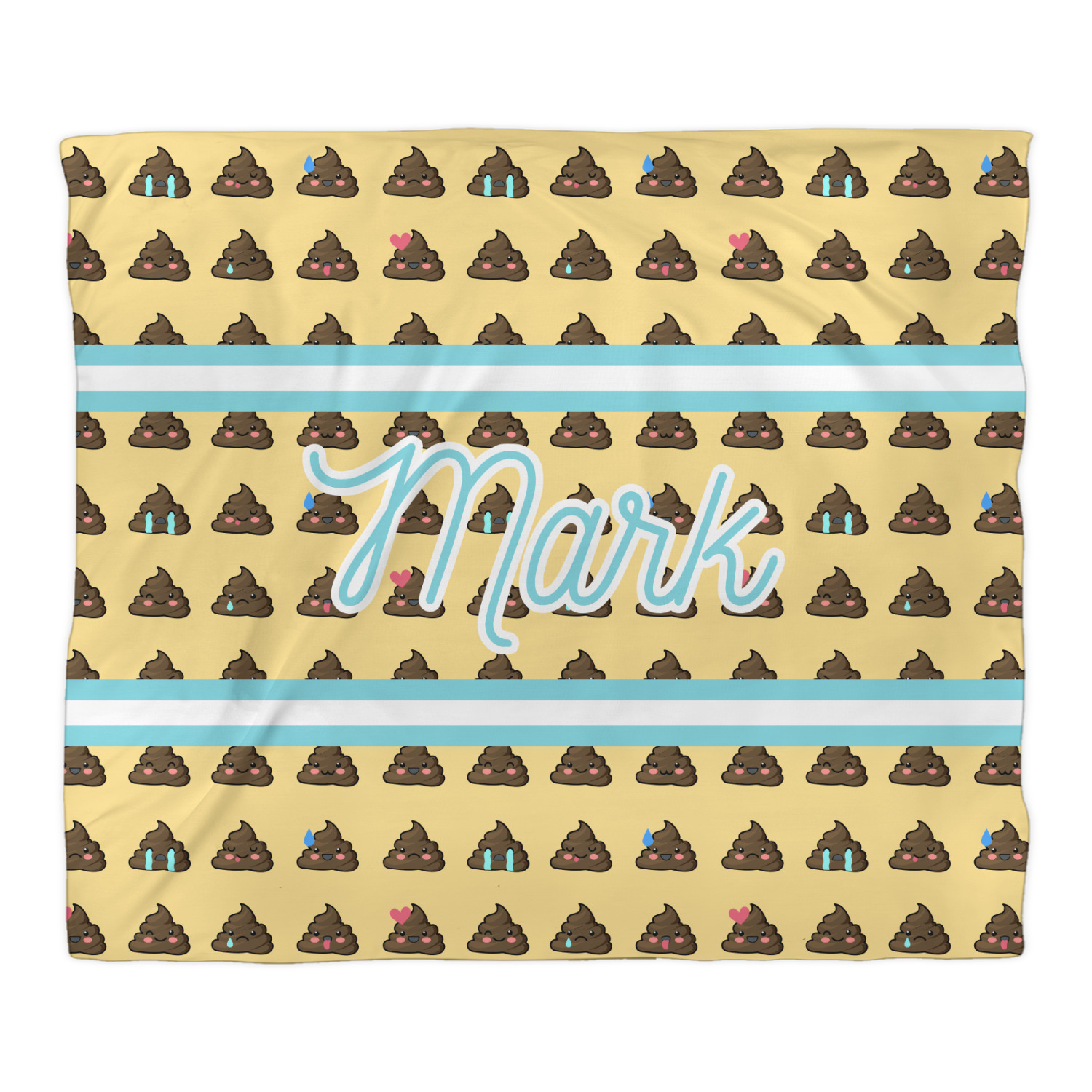 The design is a fun bright yellow with brown poop emojis all over. Each emoji is making a different face! Two light teal / turquoise ribbons are use to frame your personalization in the middle of the design. The coordinating design has a fun speckled yellow background with a large poop emoji right in the middle, saying "Oh, Poo!" underneath.
