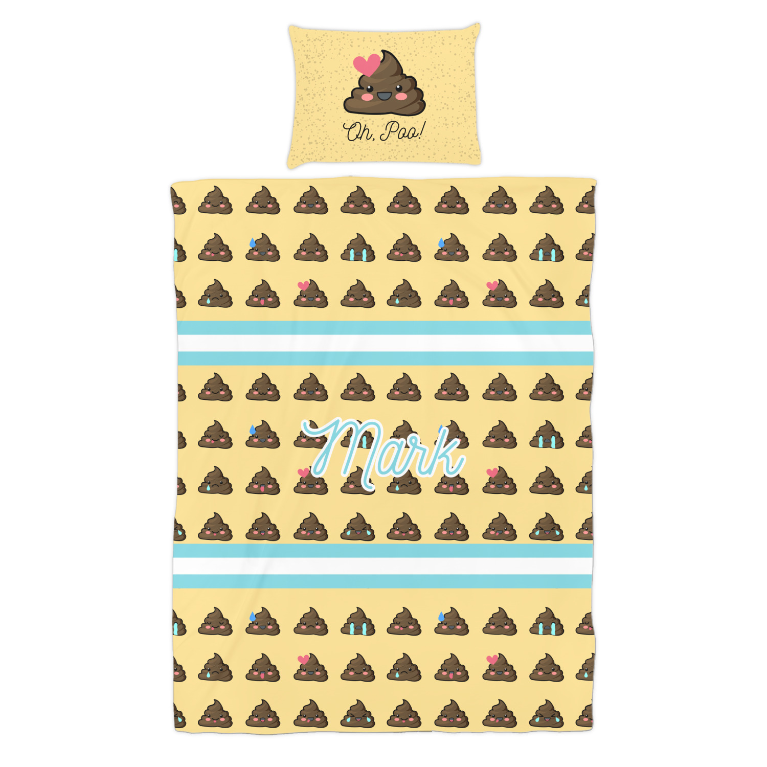 The design is a fun bright yellow with brown poop emojis all over. Each emoji is making a different face! Two light teal / turquoise ribbons are use to frame your personalization in the middle of the design. The coordinating design has a fun speckled yellow background with a large poop emoji right in the middle, saying "Oh, Poo!" underneath.