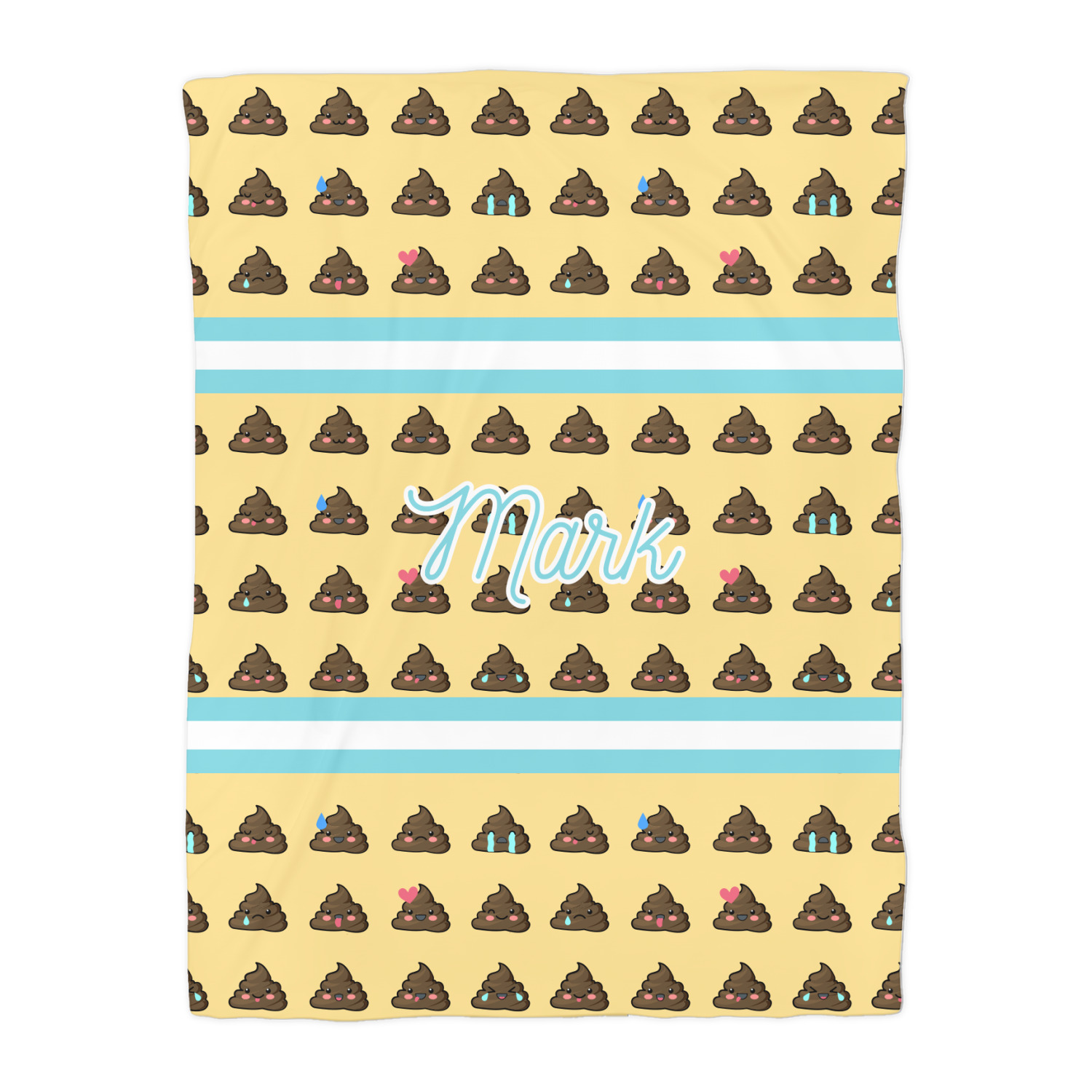 The design is a fun bright yellow with brown poop emojis all over. Each emoji is making a different face! Two light teal / turquoise ribbons are use to frame your personalization in the middle of the design. The coordinating design has a fun speckled yellow background with a large poop emoji right in the middle, saying "Oh, Poo!" underneath.