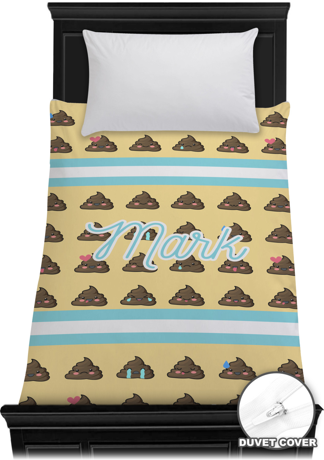 The design is a fun bright yellow with brown poop emojis all over. Each emoji is making a different face! Two light teal / turquoise ribbons are use to frame your personalization in the middle of the design. The coordinating design has a fun speckled yellow background with a large poop emoji right in the middle, saying "Oh, Poo!" underneath.