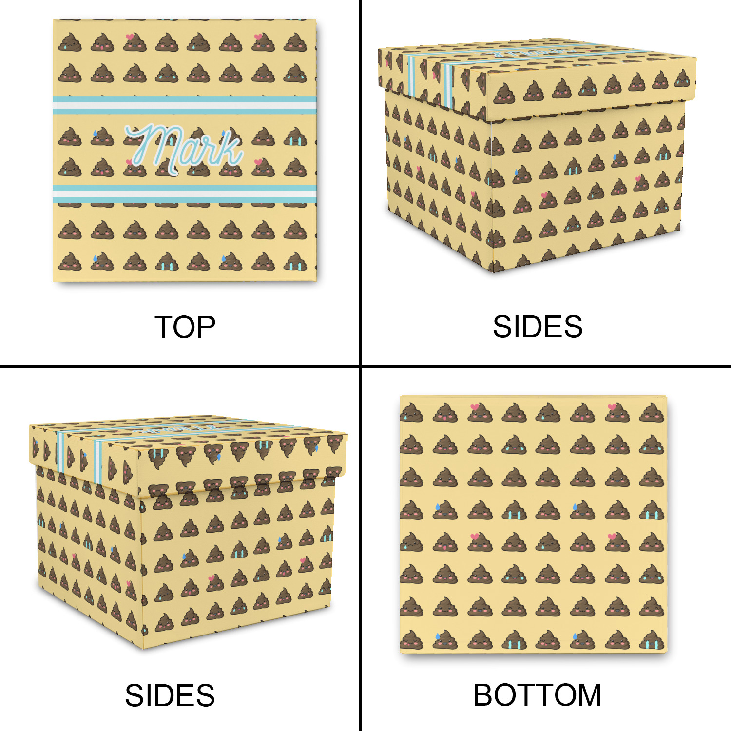 The design is a fun bright yellow with brown poop emojis all over. Each emoji is making a different face! Two light teal / turquoise ribbons are use to frame your personalization in the middle of the design. The coordinating design has a fun speckled yellow background with a large poop emoji right in the middle, saying "Oh, Poo!" underneath.