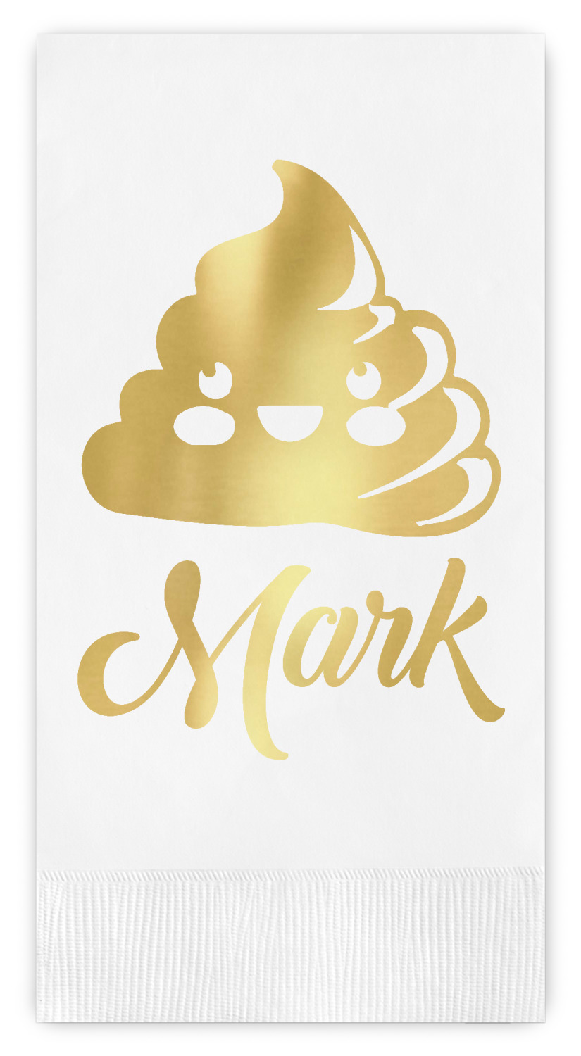 The design is a fun bright yellow with brown poop emojis all over. Each emoji is making a different face! Two light teal / turquoise ribbons are use to frame your personalization in the middle of the design. The coordinating design has a fun speckled yellow background with a large poop emoji right in the middle, saying "Oh, Poo!" underneath.