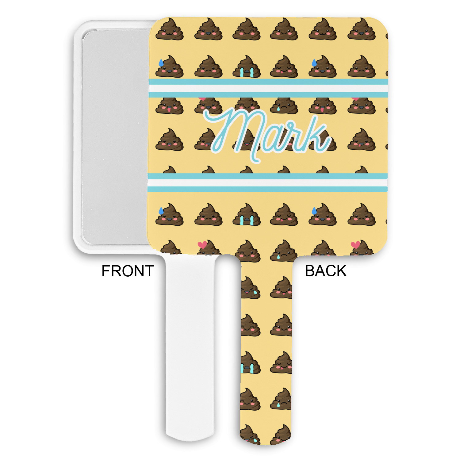 The design is a fun bright yellow with brown poop emojis all over. Each emoji is making a different face! Two light teal / turquoise ribbons are use to frame your personalization in the middle of the design. The coordinating design has a fun speckled yellow background with a large poop emoji right in the middle, saying "Oh, Poo!" underneath.