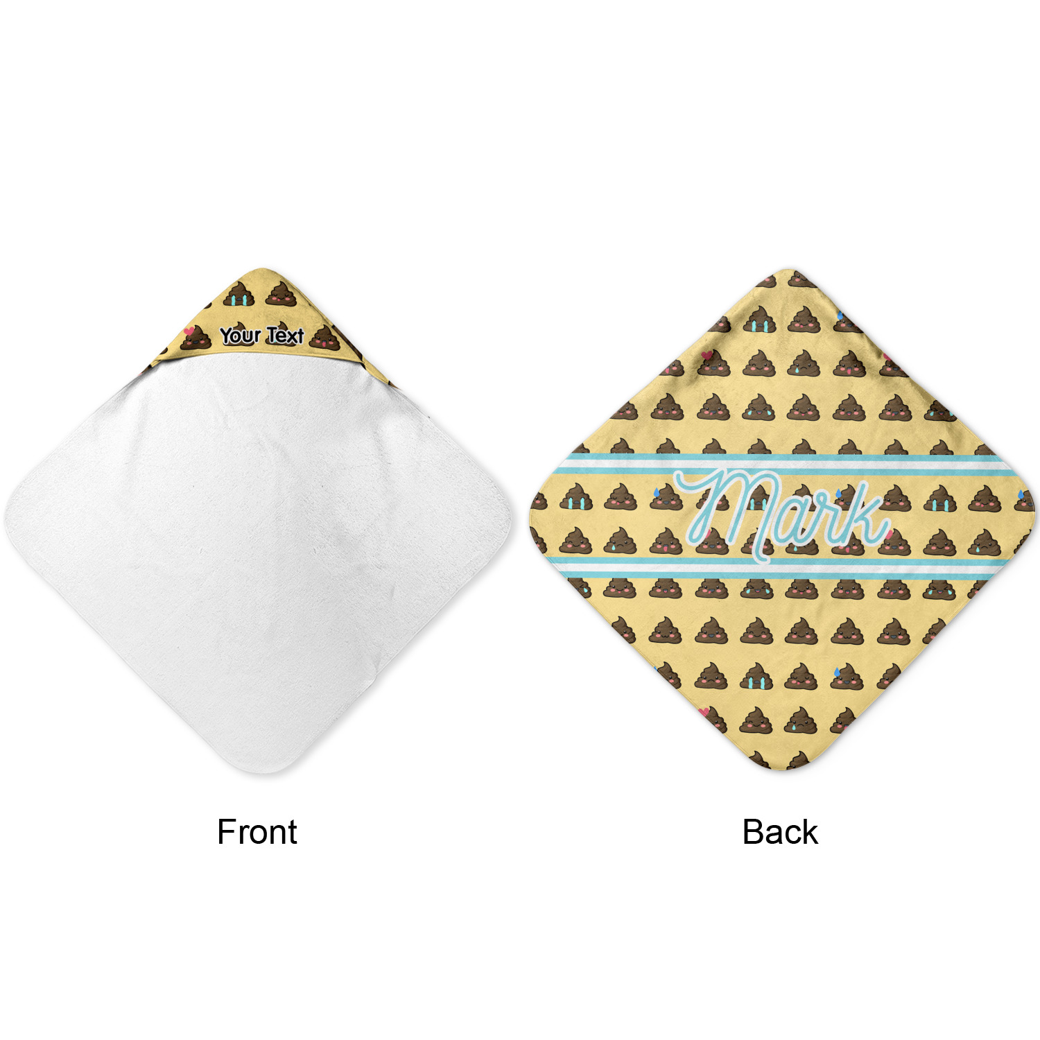 The design is a fun bright yellow with brown poop emojis all over. Each emoji is making a different face! Two light teal / turquoise ribbons are use to frame your personalization in the middle of the design. The coordinating design has a fun speckled yellow background with a large poop emoji right in the middle, saying "Oh, Poo!" underneath.