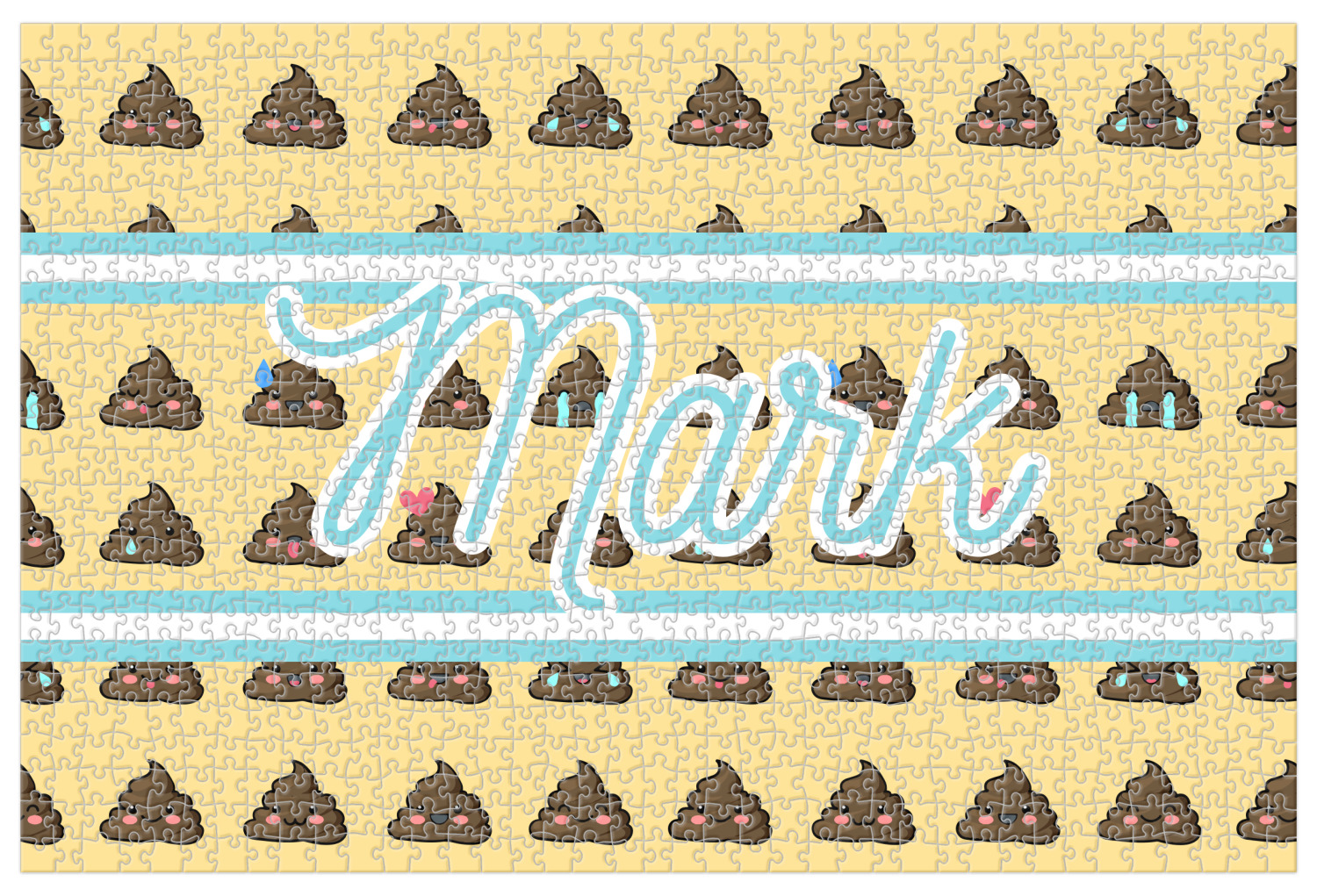 The design is a fun bright yellow with brown poop emojis all over. Each emoji is making a different face! Two light teal / turquoise ribbons are use to frame your personalization in the middle of the design. The coordinating design has a fun speckled yellow background with a large poop emoji right in the middle, saying "Oh, Poo!" underneath.