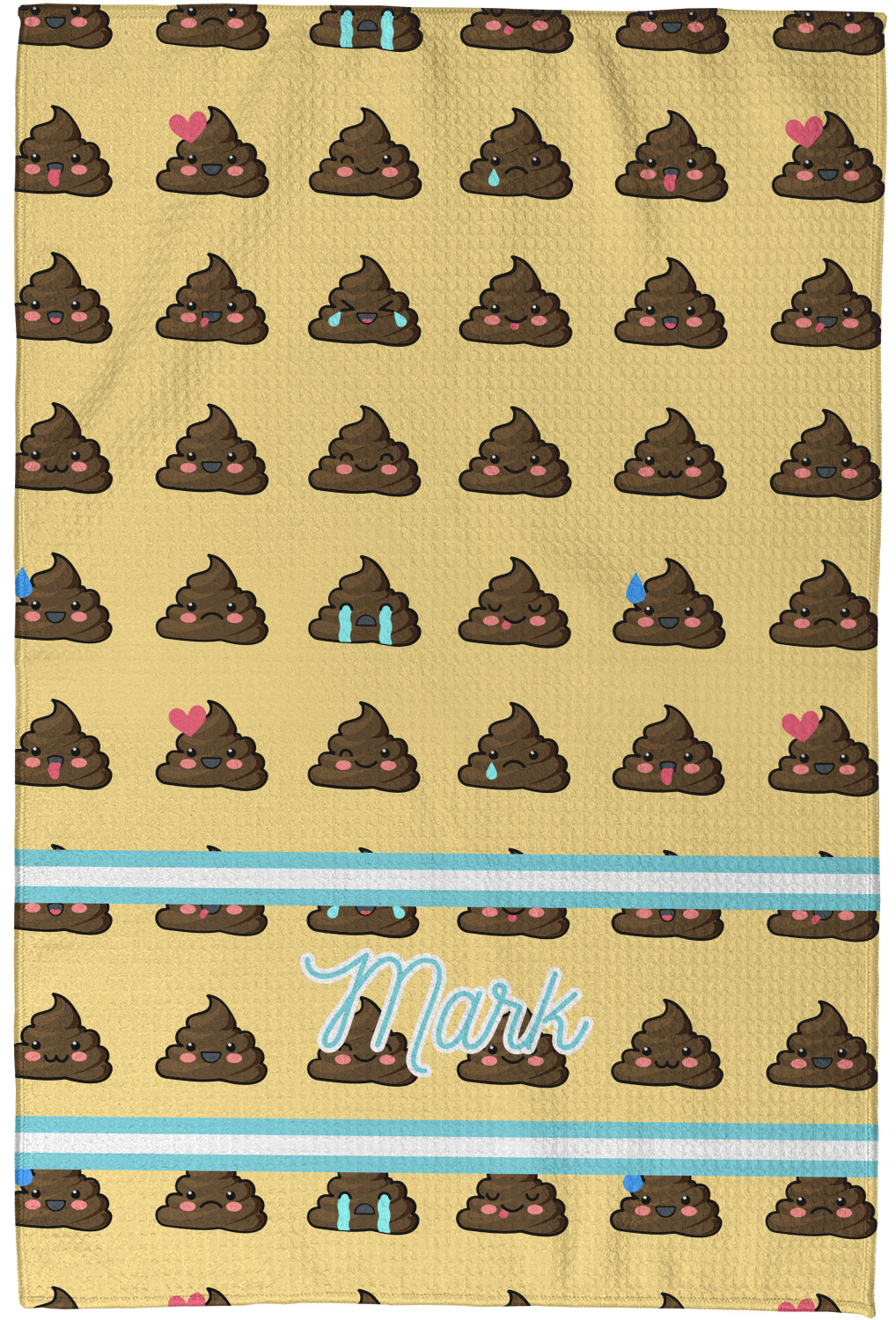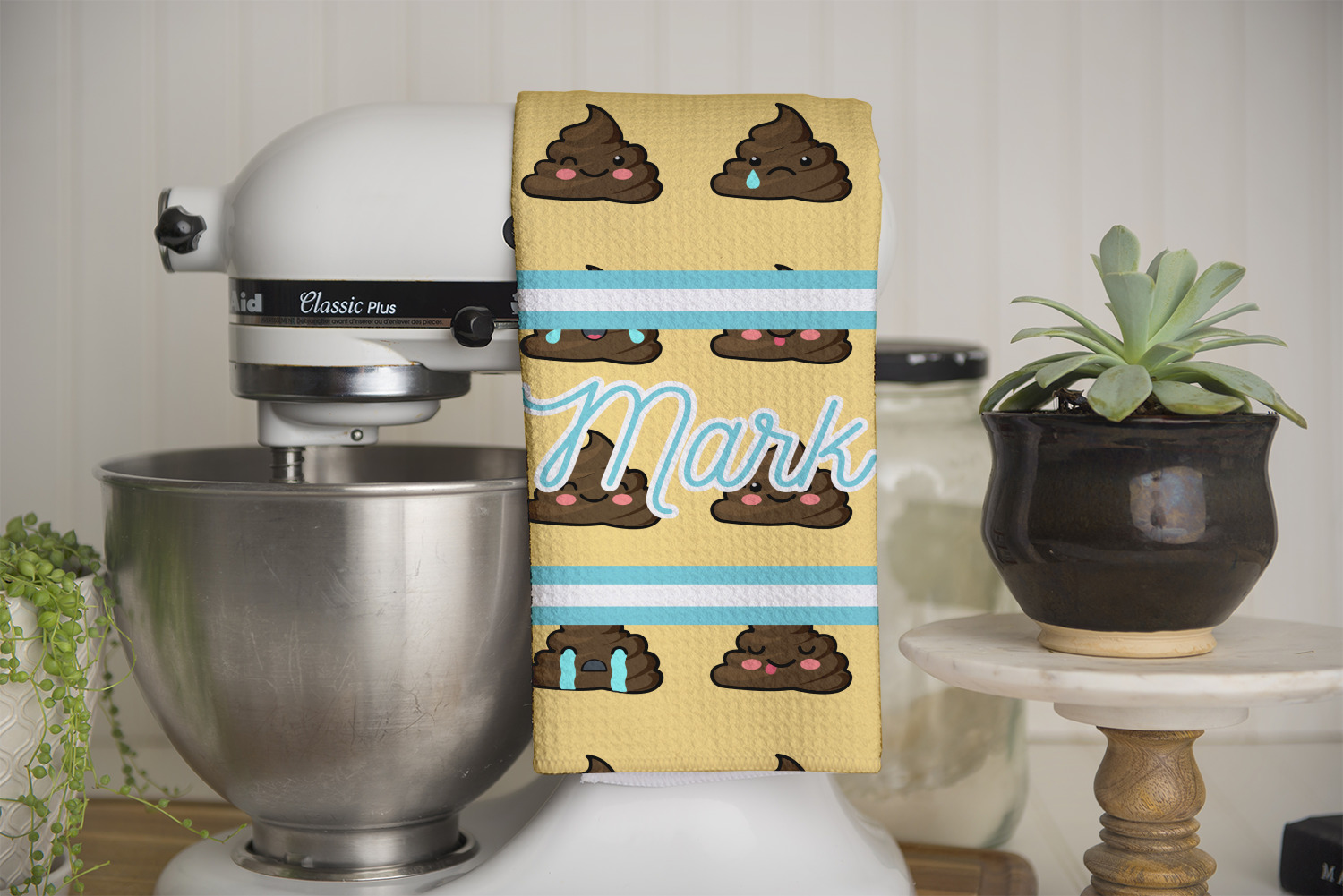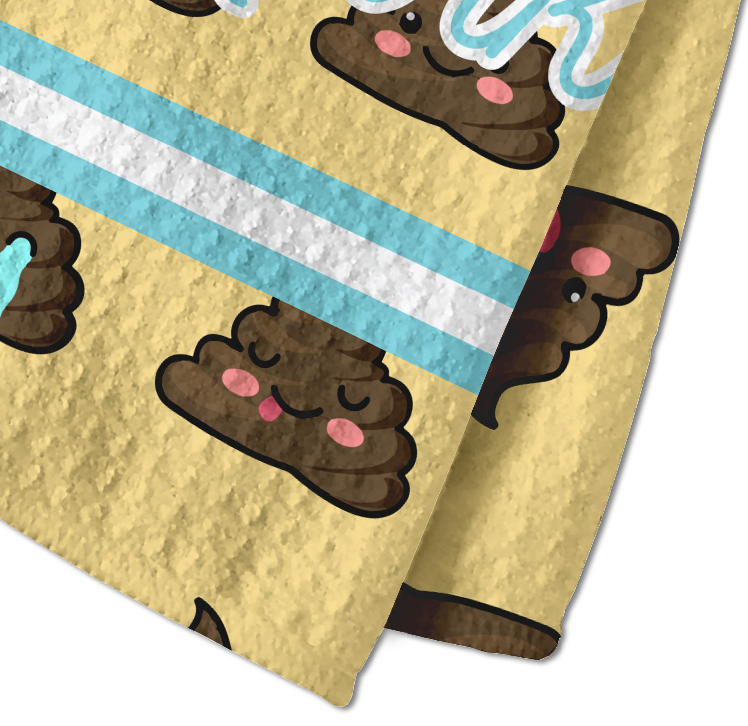 The design is a fun bright yellow with brown poop emojis all over. Each emoji is making a different face! Two light teal / turquoise ribbons are use to frame your personalization in the middle of the design. The coordinating design has a fun speckled yellow background with a large poop emoji right in the middle, saying "Oh, Poo!" underneath.