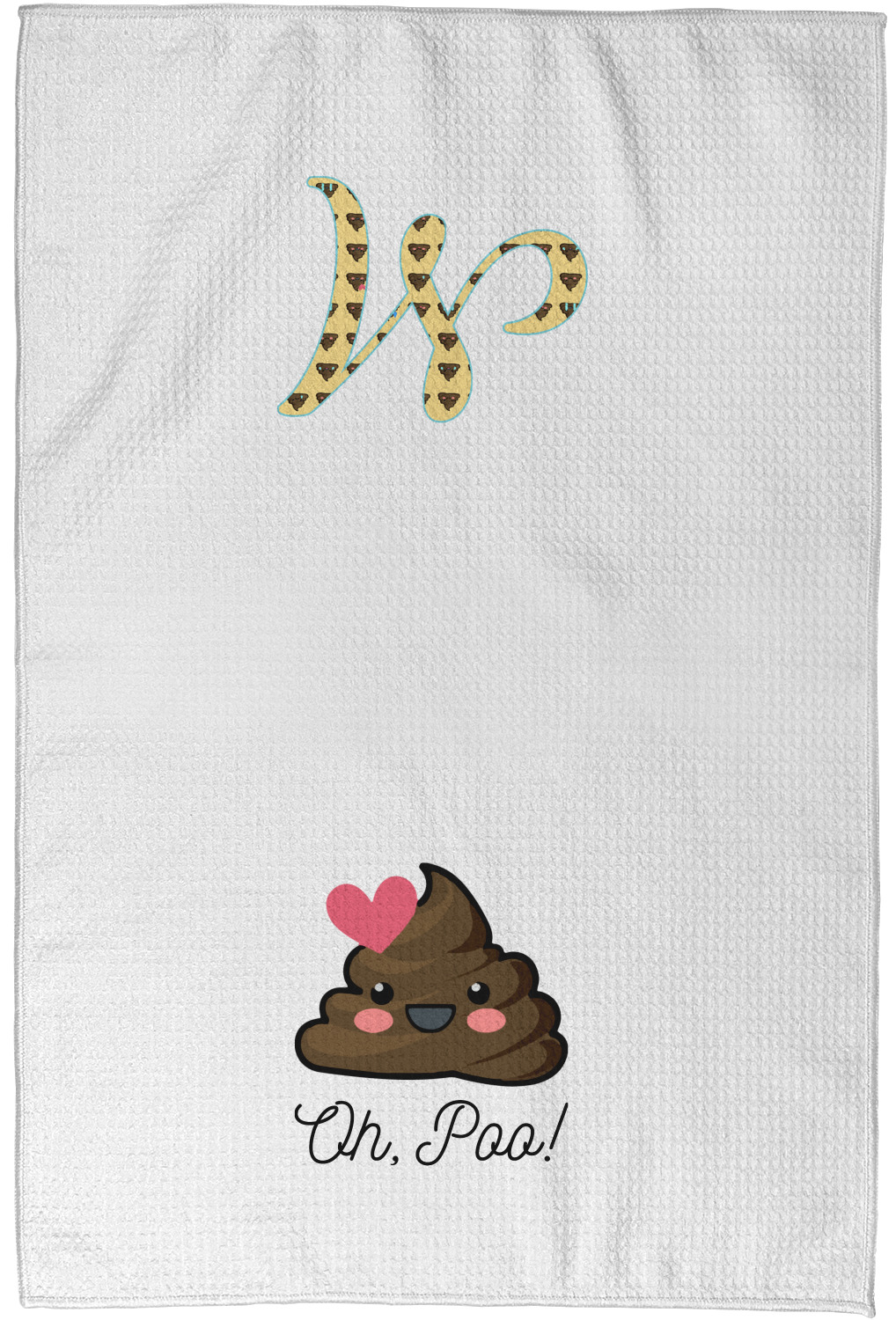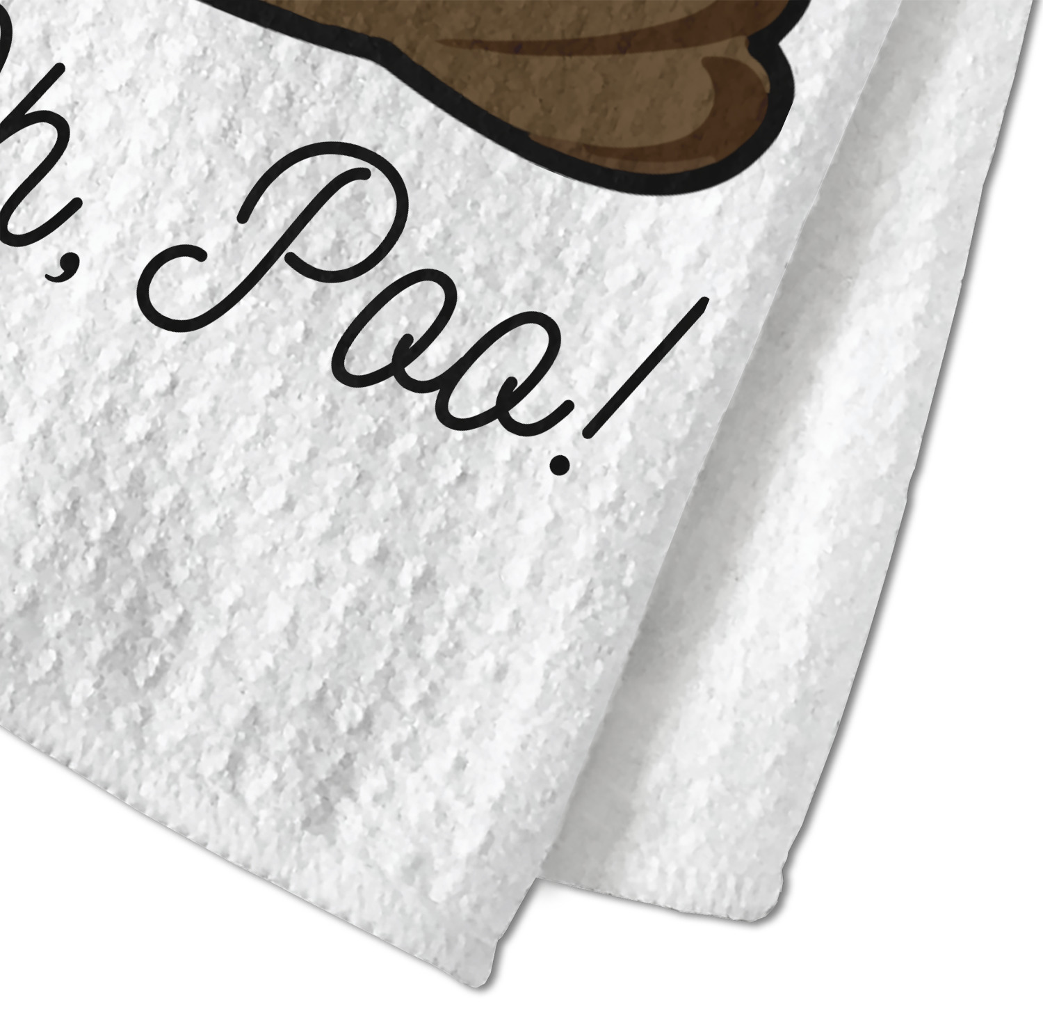 The design is a fun bright yellow with brown poop emojis all over. Each emoji is making a different face! Two light teal / turquoise ribbons are use to frame your personalization in the middle of the design. The coordinating design has a fun speckled yellow background with a large poop emoji right in the middle, saying "Oh, Poo!" underneath.
