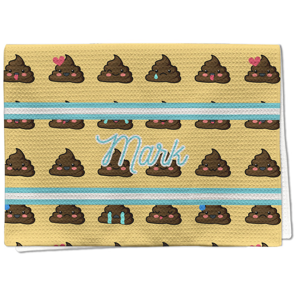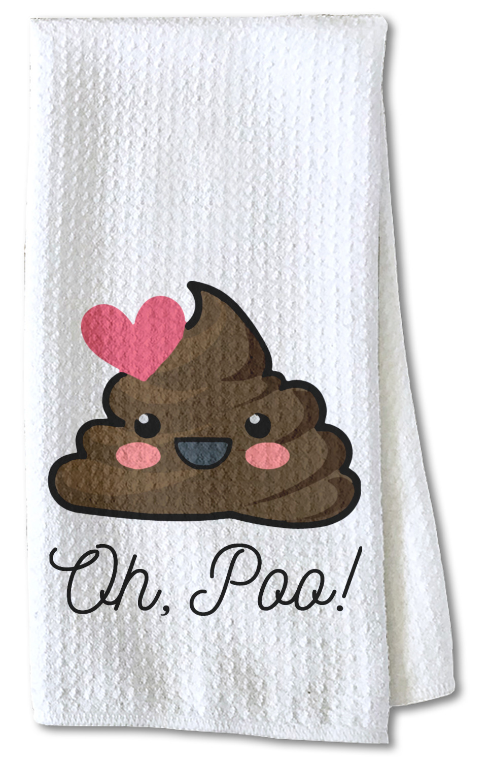 The design is a fun bright yellow with brown poop emojis all over. Each emoji is making a different face! Two light teal / turquoise ribbons are use to frame your personalization in the middle of the design. The coordinating design has a fun speckled yellow background with a large poop emoji right in the middle, saying "Oh, Poo!" underneath.