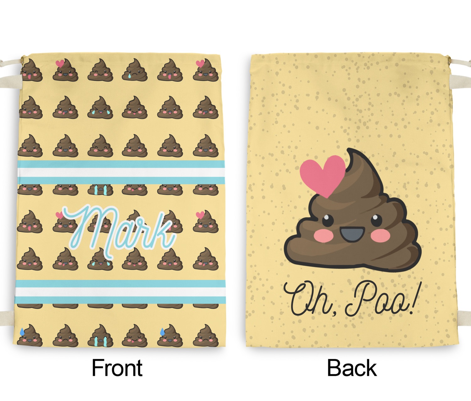 The design is a fun bright yellow with brown poop emojis all over. Each emoji is making a different face! Two light teal / turquoise ribbons are use to frame your personalization in the middle of the design. The coordinating design has a fun speckled yellow background with a large poop emoji right in the middle, saying "Oh, Poo!" underneath.