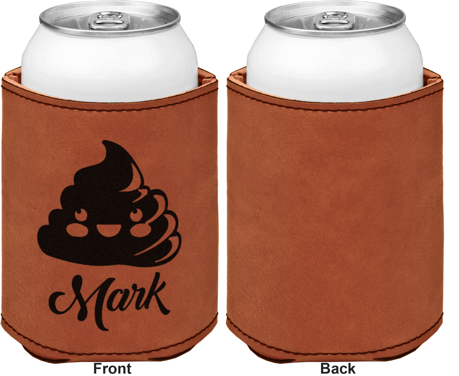 This can sleeve is made from a cognac-brown leatherette and stitched with a sturdy, black thread. A slim padding lines the inside of your can sleeve to allow for a better fit once your drink is inserted. The sleeve itself measures at 4 by 4.5 inches, allowing this custom can sleeve to accommodate most canned drinks. Your personalized design can be engraved on the front and back, or solely the front. When laser-engraved, your design appears as a black coloration which contrasts the leatherette nicely.