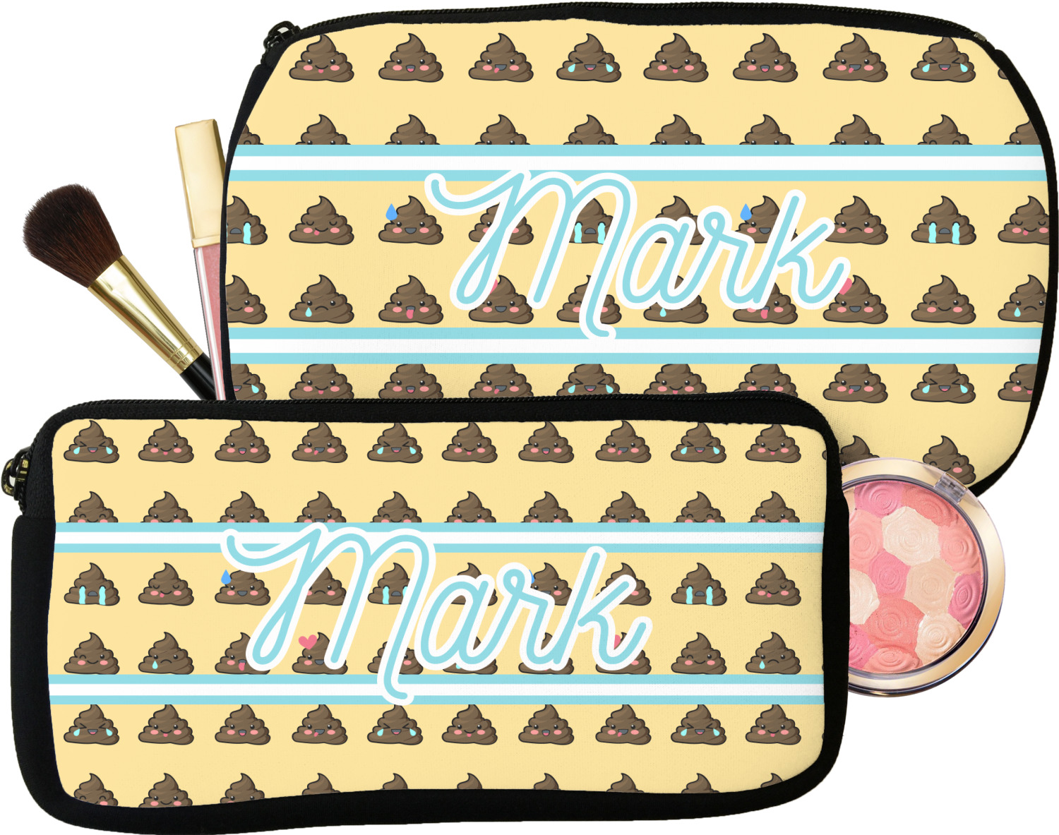 Our personalized makeup bags are available in many different designs, patterns and colors - so you are sure to find one that will love. They are made of neoprene (same material as wet-suits) and thus are water resistant, so spillages in your makeup bag will not end up all over you purse. They are customized on one side and are black on the other side and the zipper is black as well.