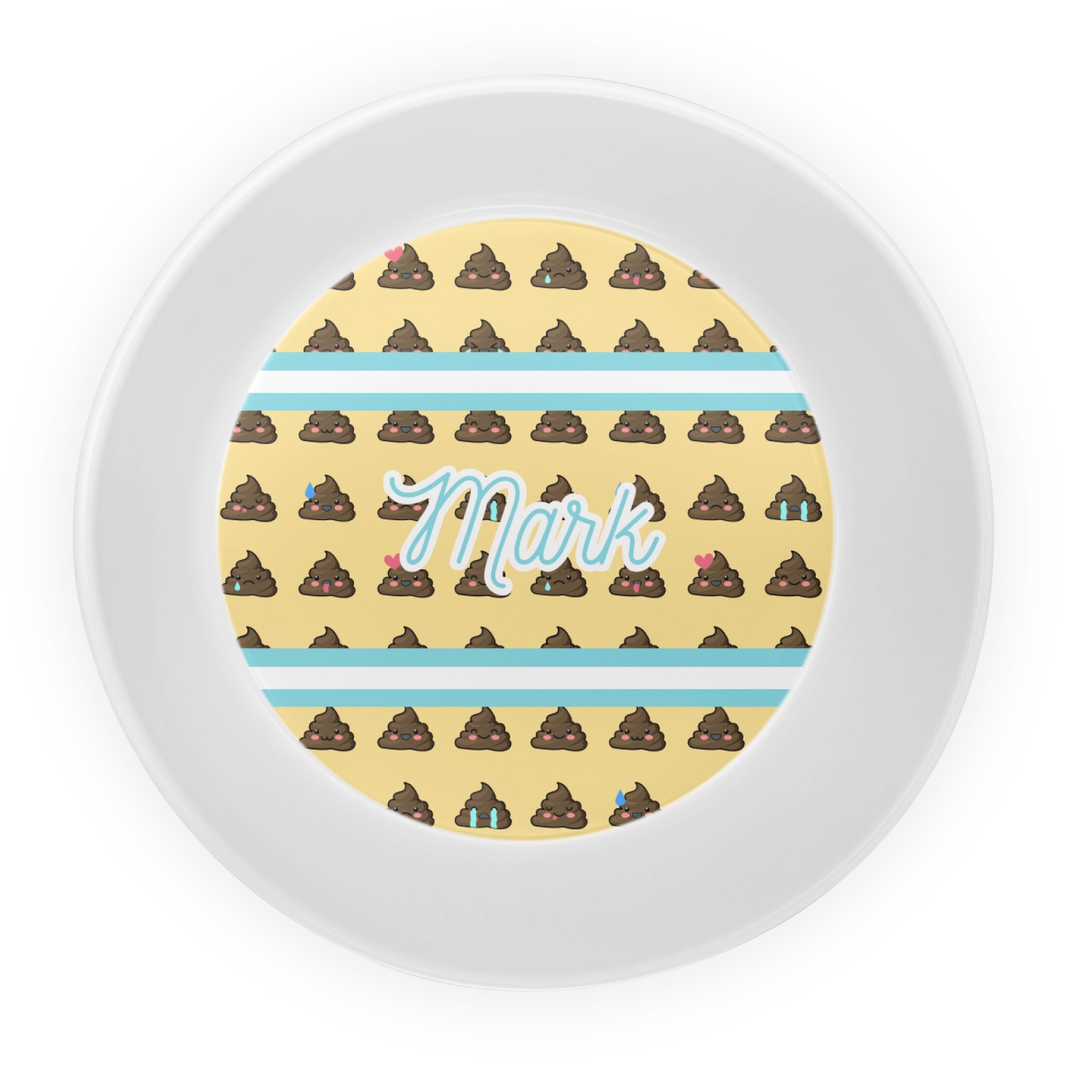 The design is a fun bright yellow with brown poop emojis all over. Each emoji is making a different face! Two light teal / turquoise ribbons are use to frame your personalization in the middle of the design. The coordinating design has a fun speckled yellow background with a large poop emoji right in the middle, saying "Oh, Poo!" underneath.