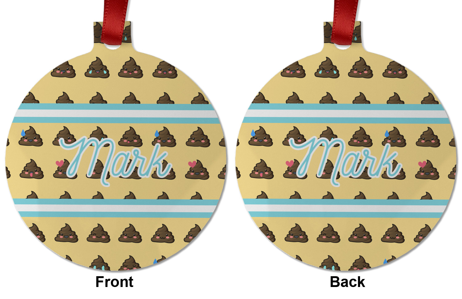 The design is a fun bright yellow with brown poop emojis all over. Each emoji is making a different face! Two light teal / turquoise ribbons are use to frame your personalization in the middle of the design. The coordinating design has a fun speckled yellow background with a large poop emoji right in the middle, saying "Oh, Poo!" underneath.