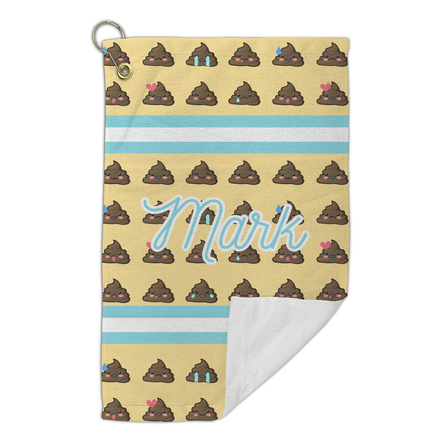 The design is a fun bright yellow with brown poop emojis all over. Each emoji is making a different face! Two light teal / turquoise ribbons are use to frame your personalization in the middle of the design. The coordinating design has a fun speckled yellow background with a large poop emoji right in the middle, saying "Oh, Poo!" underneath.